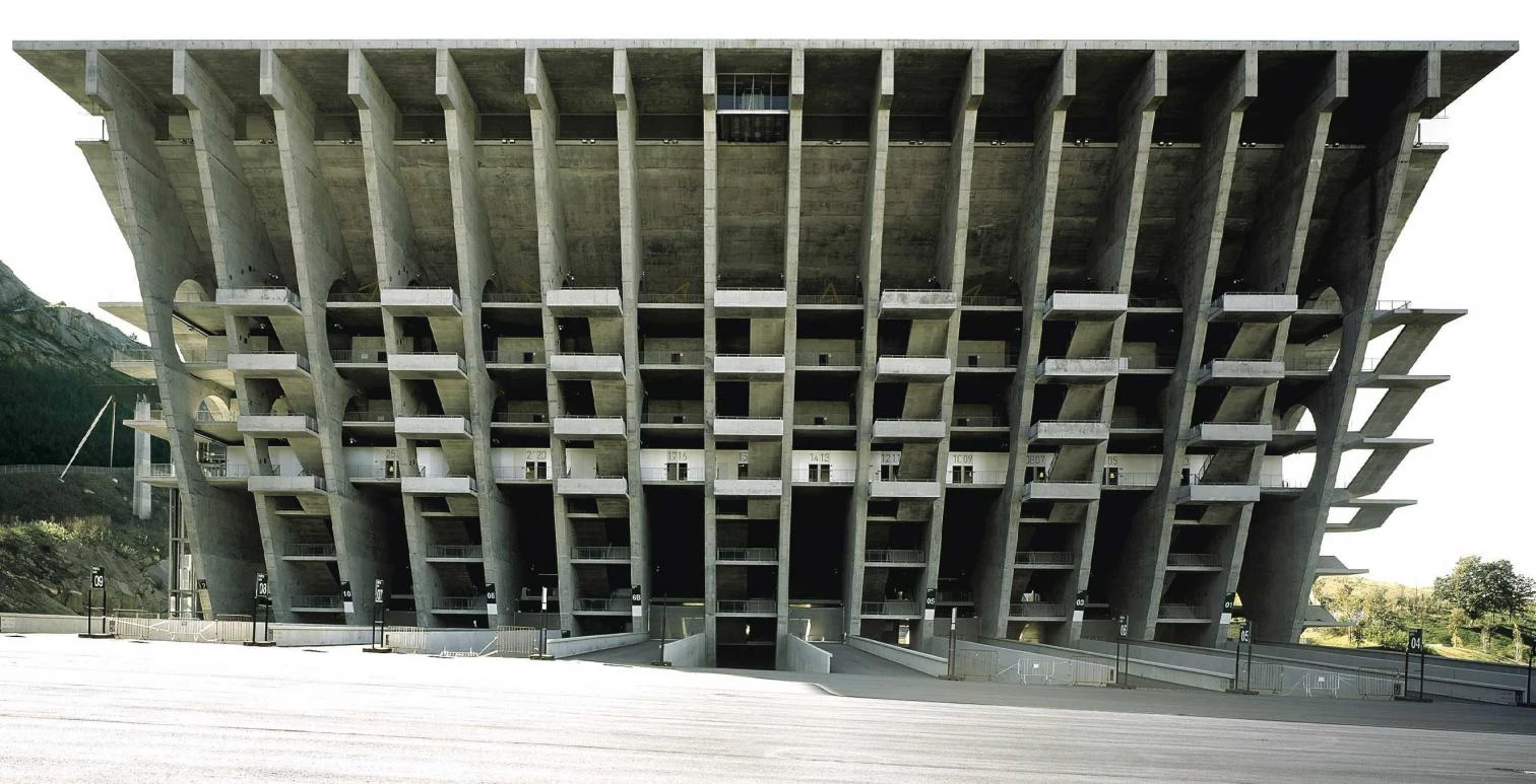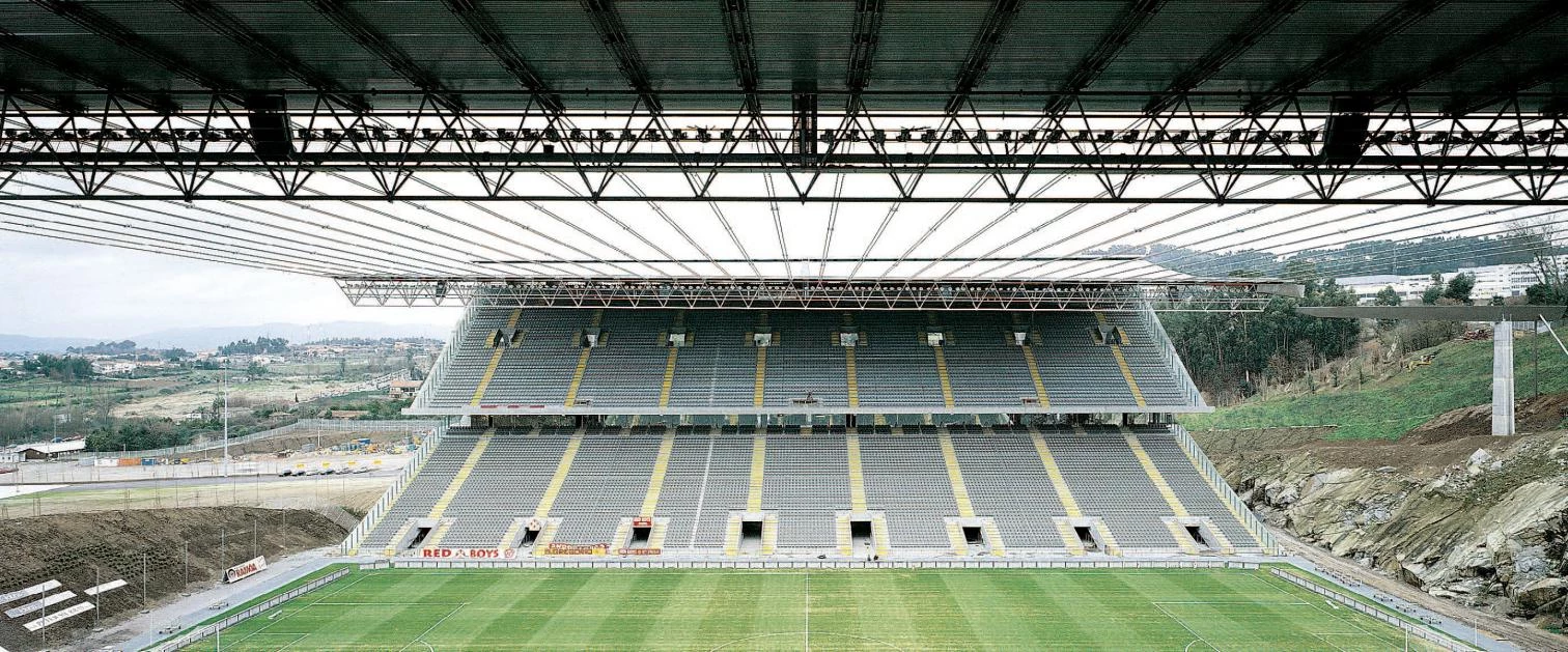 De una belleza áspera que no es ajena al contraste entre la pared rocosa de la cantera que cierra uno de sus fondos —el otro está abierto al paisaje lejano— y la exigente geometría de hormigón de la colosal obra civil, el estadio de Souto de Moura se cubre con una marquesina inicialmente propuesta como una lámina continua similar al dosel de hormigón realizado por Álvaro Siza en el pabellón de la Expo de Lisboa, y finalmente ejecutada con un sistema discontinuo inspirado, según el arquitecto, en los puentes suspendidos del Perú indígena. La marquesina, que se interrumpe en el rectángulo del campo de juego, viene a rematar sus bordes con las hileras de focos y sendos canales de evacuación de aguas que se vierten con gárgolas en dos grandes canales escultóricos sostenidos en voladizo desde el acantilado. Las titánicas pantallas de hormigón que soportan la tribuna exenta se aligeran con las perforaciones circulares que permiten el movimiento transversal y la elegancia musical de las escaleras intercaladas —que incluso se suplementan con un último módulo puramente compositivo—, llegando a parecer de una ligereza papirofléxica con la inmaterialidad que otorga la iluminación nocturna. Desde la plaza situada frente a ella acceden los espectadores, que para llegar a la tribuna apoyada en la roca deben atravesar una gran sala hipóstila, con columnas de capitel troncocónico, que se extiende bajo el césped del campo; otra plaza, realizada sobre el acantilado de la cantera a una cota cuarenta metros superior, y con un uso de aparcamiento VIP, permite un acceso restringido a las zonas de palcos y prensa.