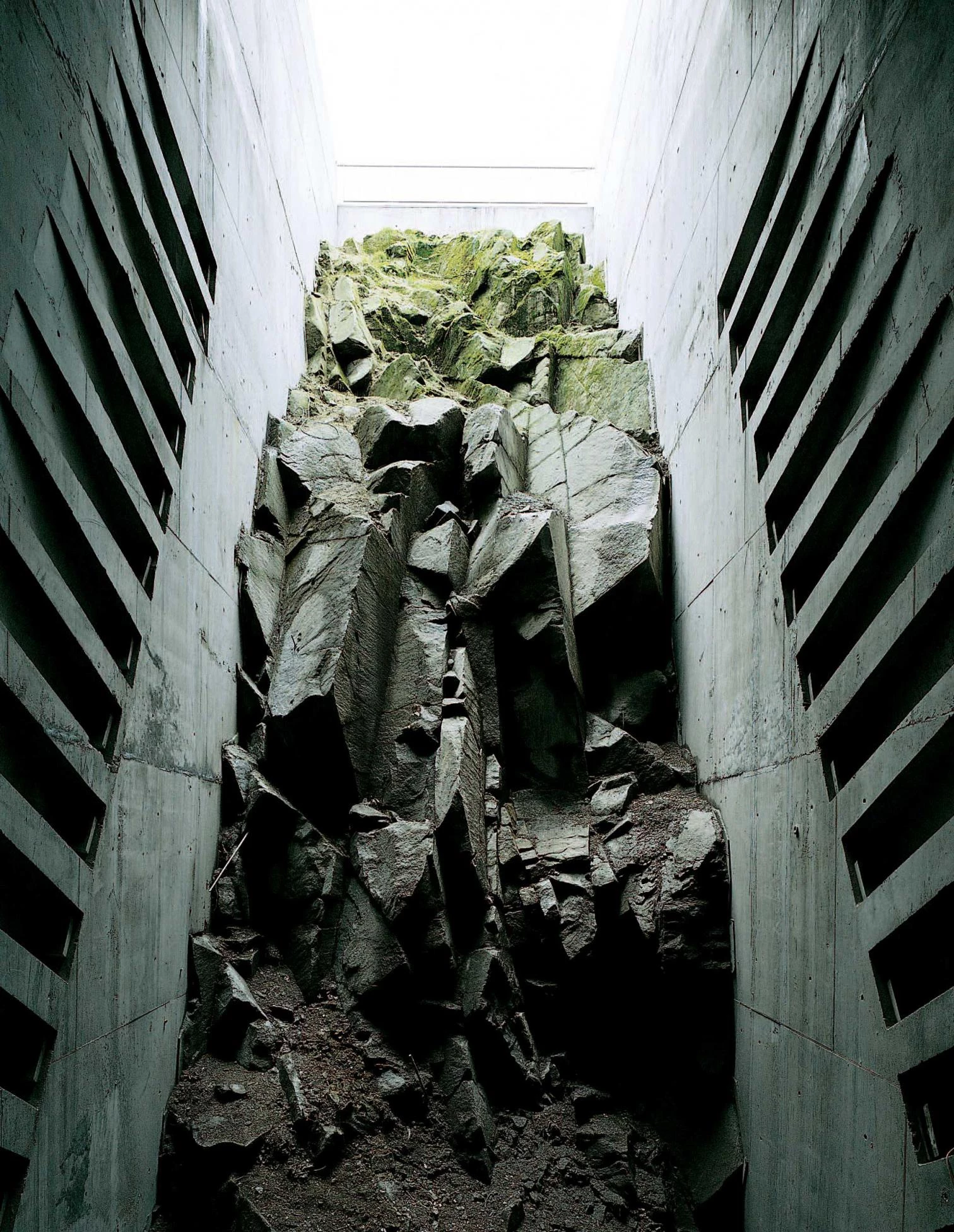 Para adaptarse al lugar se levantan dos tribunas enfrentadas, una que se apoya en la pared de roca, y otra que se eleva exenta, formada por una sucesión de escultóricas pantallas de hormigón, a la vez sólidas e ingrávidas.