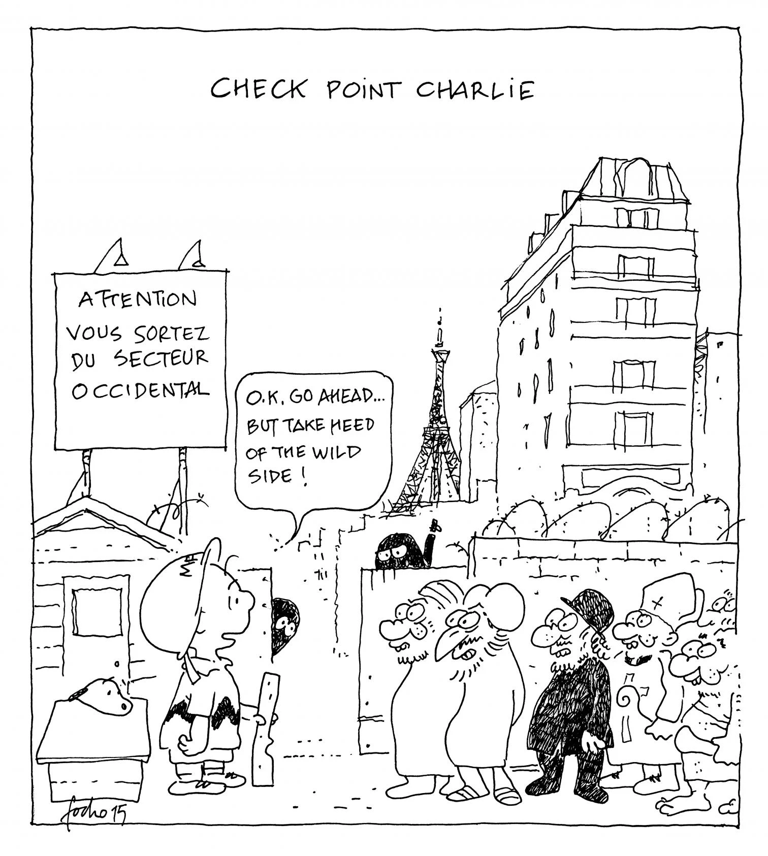 Esta revista no puede ser ajena a la conmoción que ha supuesto para Francia y el mundo los atentados del 7 de enero en París, que costaron la vida a 17 inocentes, y quiere rendir homenaje a Charlie Hebdo y, en general, a esa libertad de expresión sobre la que, desde hace dos siglos, se han levantado los valores de la civilización. Con este fin recogemos arriba dos portadas: la primera, correspondiente al New Yorker y dibujada por la ilustradora española Ana Juan, fue una de las más sutiles de las muchas que dieron cuenta gráficamente de la tragedia; la segunda es la que, con una tirada histórica de cinco millones de ejemplares, publicó el semanario satírico francés tras los bárbaros asesinatos, con el lema que ha aglutinado la protesta, ‘Je suis Charlie’, bajo el conciliador mensaje ‘Tout est pardonné’ (todo perdonado). A ello sumamos el dibujo de Focho, titulado ‘Checkpoint Charlie’, que alude al muro derribado en Berlín hace poco más de 25 años, pero que es, en realidad, una metáfora de la frontera que separa dos modos de entender la vida: de un lado, el del extremismo ciego y violento propio de épocas que creíamos periclitadas; del otro, el de la tolerancia de ese Charlie Brown que dio nombre a Charlie Hebdo y que Focho representa dirigiéndose a varios de los personajes que protagonizan el humor cáustico e irreverente de la revista francesa, a los que advierte: «Tened cuidado cuando paséis al lado salvaje». Esperemos que la barbarie se quede siempre ahí: en el lado salvaje.