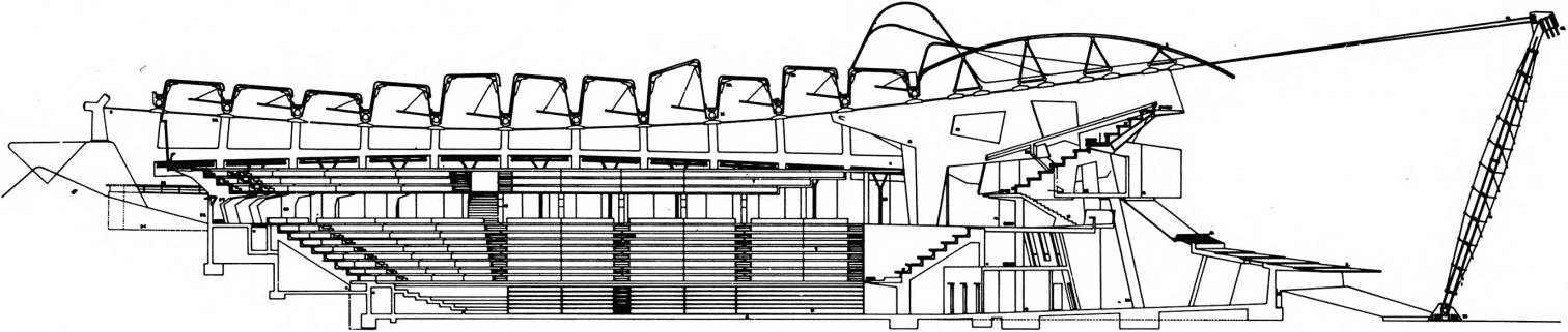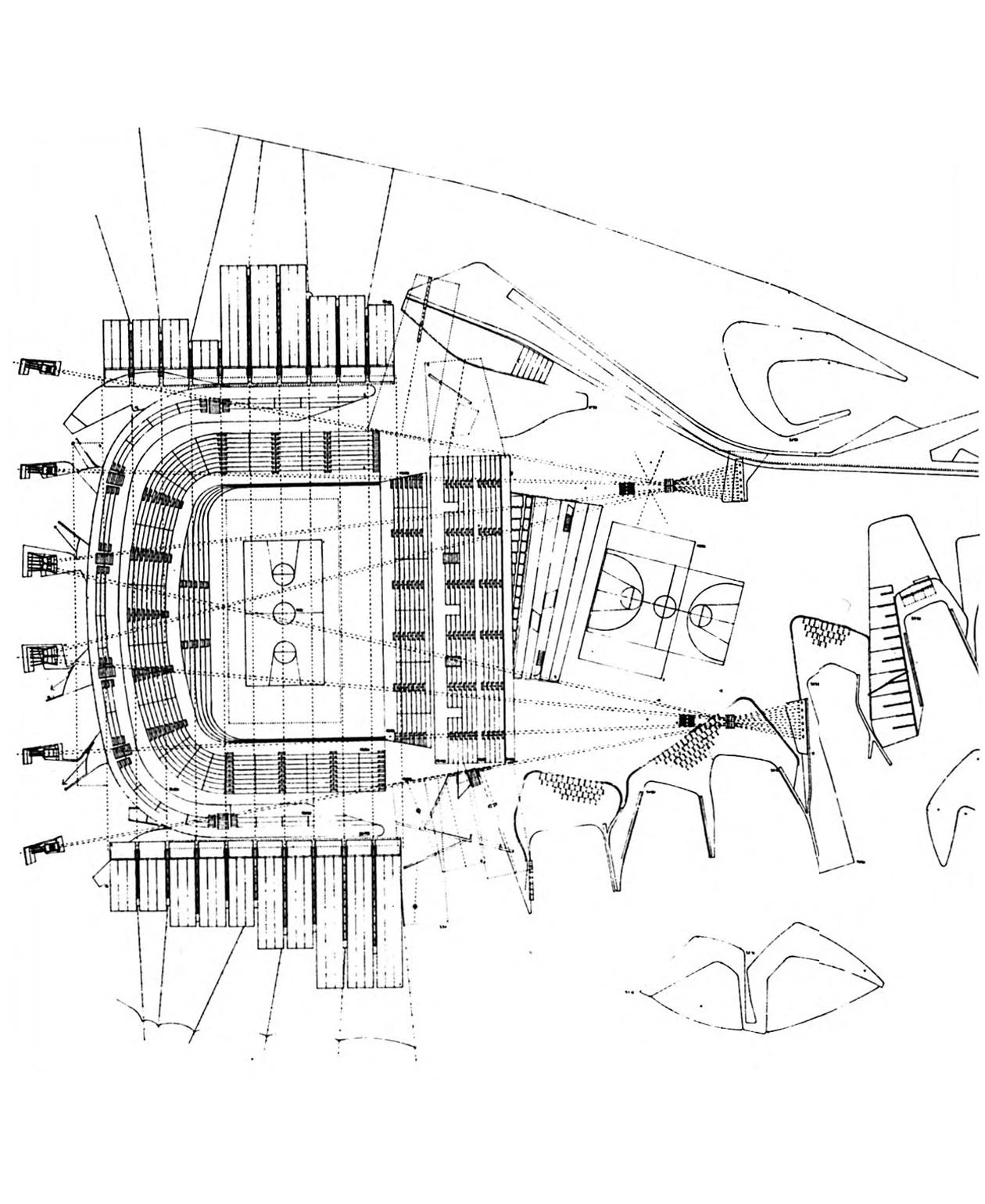 Los planos y las imágenes de obra del Palacio de los Deportes de Huesca reflejan claramente la estética inestable y la poética deconstructiva de Enríe Miralles.