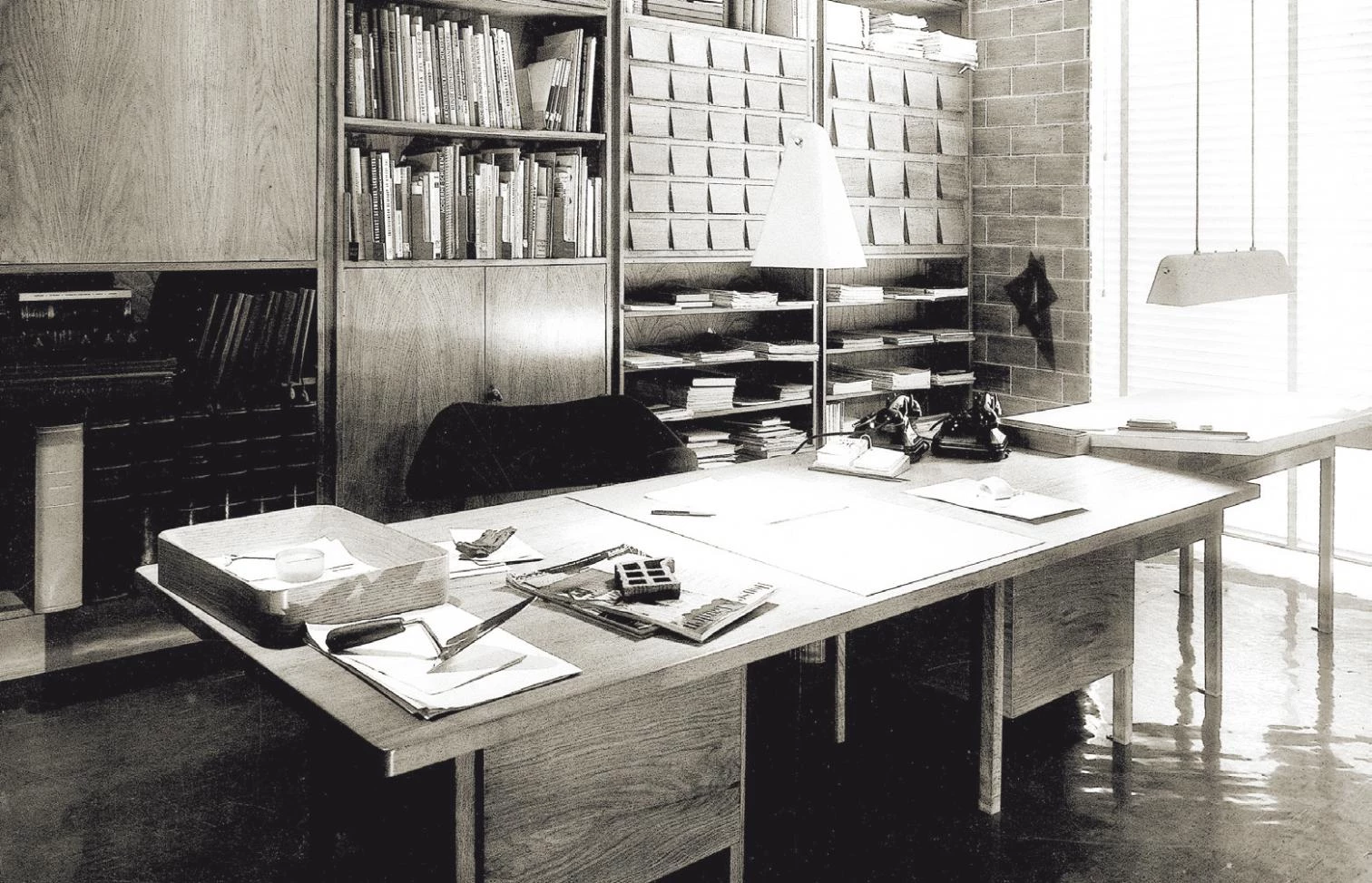 El despacho del arquitecto en su primer estudio, con una paleta de albañil y un ladrillo diseñado por él.