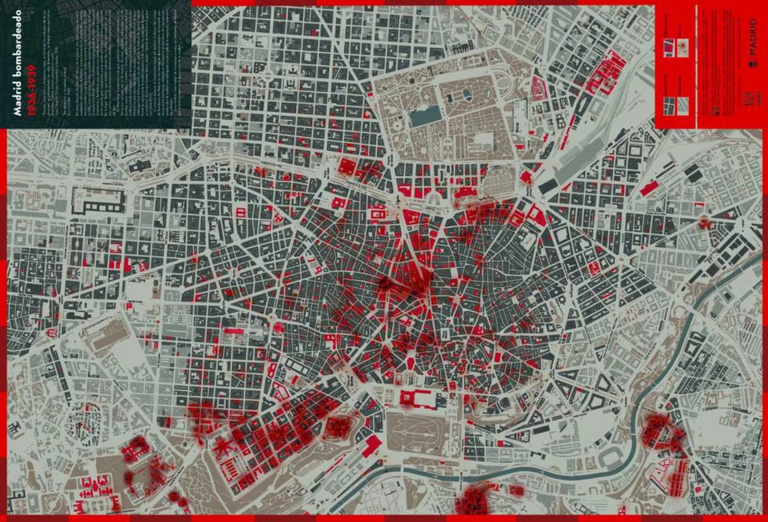 Madrid vivió asediada bajo el impacto de los proyectiles y las bombas durante los tres años que duró la Guerra Civil. Un largo conflicto que dejó una ciudad devastada y en la que apenas quedó un barrio, una zona o una calle que no se viera afectada por los ataques de las tropas del bando nacional, auxiliadas desde el aire por las aviaciones alemana e italiana. Ocho décadas después, y gracias a una minuciosa investigación de dos años, los profesores asociados de la Universidad Politécnica de Madrid, Luis de Sobrón y Enrique Bordes, han elaborado un mapa en papel donde se localizan los 1.600 edificios de la capital que se vieron afectados —en menor o mayor proporción— por el fuego enemigo entre 1936 y 1939. “Hemos sido muy conservadores. Solo hemos incluido aquellos inmuebles que están debidamente documentados, ya sea con una imagen, una referencia bibliográfica o una reseña”, explica Sobrón en conversación telefónica.