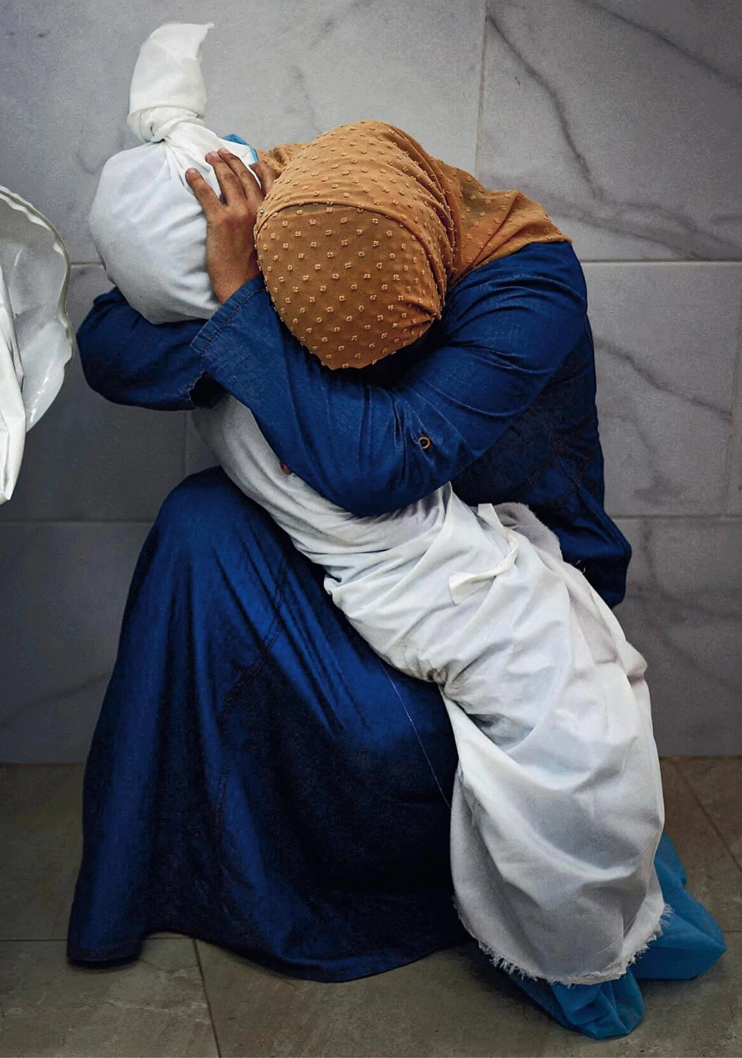 El reconocimiento de la fotografía tomada por Salem en Gaza ha sido caudaloso y unánime. Tras reproducirse innumerables veces, obtuvo en marzo el Premio Ortega y Gasset, y en abril el World Press Photo, un galardón que el fotoperiodista —vinculado a la agencia Reuters desde 2003— ya recibió en 2010. En esta ocasión, cada elemento de la instantánea contribuye a transformarla en icono: el blanco sudario, que revela la muerte tras esconder pudorosamente bajo los pliegues sus huellas atroces en el cuerpo inerte de la niña; la túnica azul, que recoge en su gesto monocromo los miembros enredados de la mujer que dobla la rodilla en desamparo y reúne los brazos asiendo la cabeza sin vida de su sobrina como si pretendiera evitar que la muerte la arrebate; y el hiyab del mismo color de las manos, única parte del cuerpo que se muestra en esta elegía textil cuyos tres tonos resumen y manifiestan la violencia y la devastación emocional del momento, en el marco higiénico de un recinto sanitario cuyo pavimento y muros se pautan con la regularidad geométrica de las losas lisas y grises.
