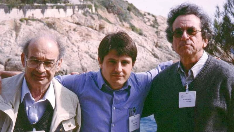 El físico español Adán Cabello (en el centro), con Asher Peres y David Mermin en 2002, un año después de su propuesta a partir del juego de los dos teóricos.