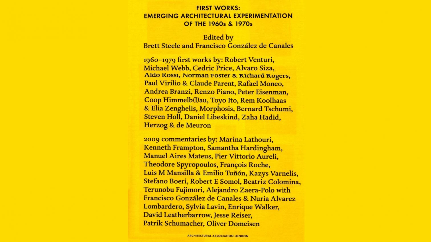Ahondar en la vida de los antepasados es un ejercicio que aúna el legítimo deseo de saber con el temor gozoso y un tanto impúdico de descubrir algo insospechado de nuestros mayores. Este libro, publicado con ocasión de la exposición homónima organizada en noviembre de 2009 por la londinense Architectural Association, tiene un poco de ambas cosas. First Works incluye obras de los inicios de veinte estudios —algunos, como Foster & Rogers, transformados en fulgurantes carreras en solitario—, que son al mismo tiempo documentos con valor arquitectónico en sí mismo y testimonios de una época de cambio: la de la crisis de la Modernidad. Los proyectos vienen precedidos de una breve memoria a cargo de sus autores, e incluyen comentarios de amigos y discípulos, como es el caso de la fábrica Diestre de Rafael Moneo —único español de la lista—, analizada por Luis Moreno Mansilla y Emilio Tuñón.