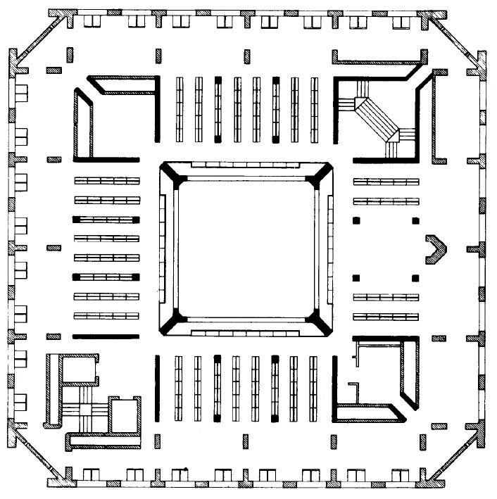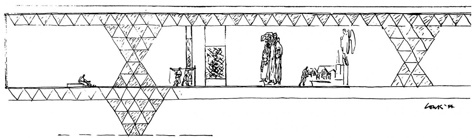 En Yale encontró Kahn su plataforma de despegue: un entorno estimulante de alumnos y profesores embarcados en la transformación de la enseñanza académica y la introducción de los principios modernos; un joven historiador del arte, Vincent Scully, que se convertiría a partir de entonces en su más activo propagandista; y un encargo, la Galería de Arte de la propia universidad, que Kahn ejecutó con una brutalidad delicada insólita en el panorama conformista de la arquitectura institucional norteamericana, con forjados de casetones tetraédricos y una escalera triangular inserta en un rotundo cilindro de hormigón que se imitaría por doquier, y que descubrió al mundo el talento singular de una figura hasta entonces marginal. El resto de la historia es universalmente conocida, y se jalona con una secuencia de obras magistrales que dieron un nuevo sentido a la monumentalidad contemporánea: edificios de solemnidad arcaica, exquisitamente construidos y rigurosamente coreografiados a través de la geometría elemental, imponentes e íntimos a la vez, y tan líricos en el modelado de la luz como elocuentes en la articulación expresiva de los encuentros entre materiales.