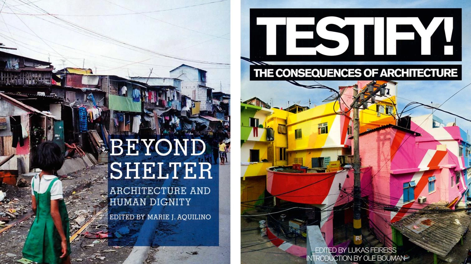 Se da la coincidencia de que los dos libros contienen 25 ejemplos de arquitecturas o actuaciones urbanas dispersas por el mundo, y cuyos objetivos en ocasiones se solapan. Ahí acaban las similitudes, pues Beyond shelter ofrece un relato denso y pormenorizado desde la perspectiva de los arquitectos y urbanistas de su trabajo en situaciones de miseria, de prevención de desastres o de reconstrucción. Se trata de una obra eminentemente discursiva, centrada más en los procesos que en los edificios terminados. Las largas disertaciones de los protagonistas nos ofrecen un relato de primera mano de las dificultades técnicas, económicas e institucionales que lastran la acción de las organizaciones no gubernamentales y de los gobiernos, y de cómo la implicación de las comunidades receptoras y la existencia de fondos no bastan para conseguir resultados satisfactorios, para los cuales es esencial contar con expertos capacitados. Así, a lo largo de seis capítulos se sostiene que las habilidades de gestión de proyectos, de reconciliación de intereses múltiples y de proyección que son esenciales para el trabajo de cualquier arquitecto pero no siempre muy valoradas, son cruciales en el ámbito de la cooperación. En cuanto a los proyectos expuestos en Testify! The consequences of architecture, estos no se limitan a intervenciones en países pobres, y cubren un espectro más amplio en cuanto a sus finalidades, divididos en cuatro capítulos que se dedican respectivamente a proyectos arquitectónicos de variada escala, a intervenciones urbanas novedosas, a espacios educativos y comunitarios, y a iniciativas innovadoras de investigación sobre la arquitectura y su impacto. En este caso, sin embargo, más que reforzar la figura tradicional del arquitecto se defiende la necesidad de que este intervenga en procesos de jerarquías más laxas en los que los usuarios tengan una mayor voz.