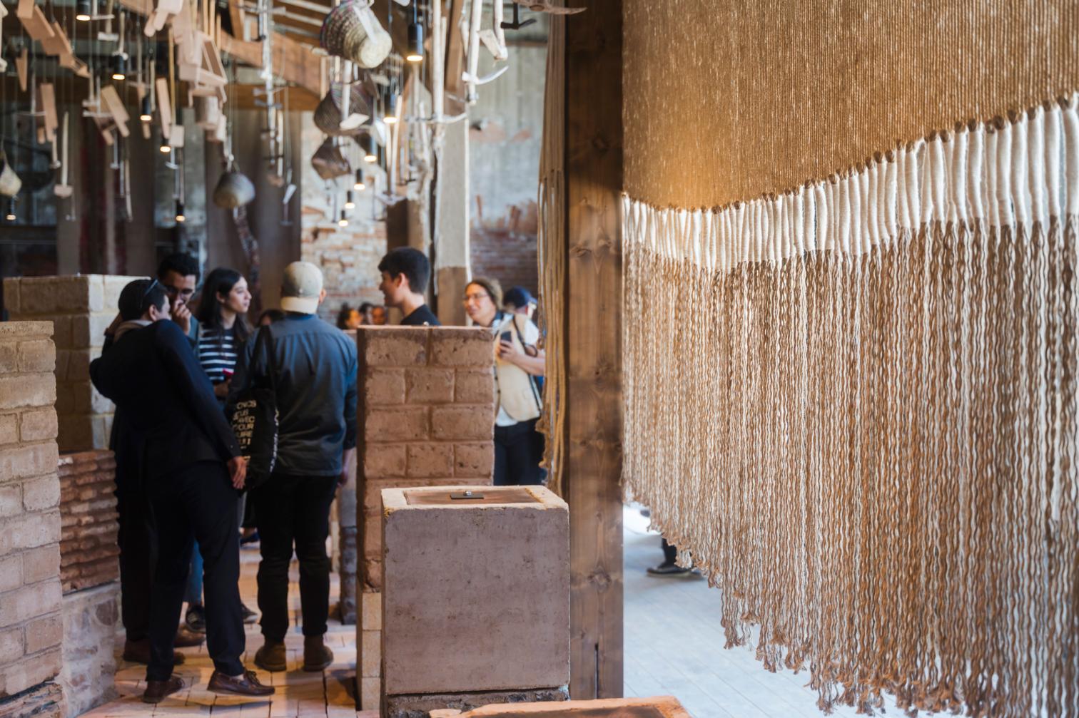 Más allá de exaltar las virtudes de este recurso constructivo, ‘Materiae Palimpsest’ invita a reflexionar sobre los límites del progreso y la necesidad de conservar la sabiduría acumulada durante generaciones. Esta voluntad reluce en cada uno de los elementos que componen el pabellón: desde el velo que lo envuelve, elaborado por la artista Soumiya Jalal con técnicas tradicionales de hilado, hasta el bosque de columnas, construidas mediante la superposición por tongadas de distintos métodos autóctonos de trabajar la tierra, o el dosel compuesto por útiles de trabajo colgados a salva mano.