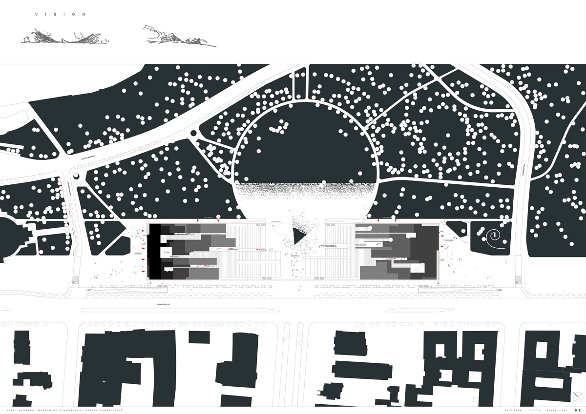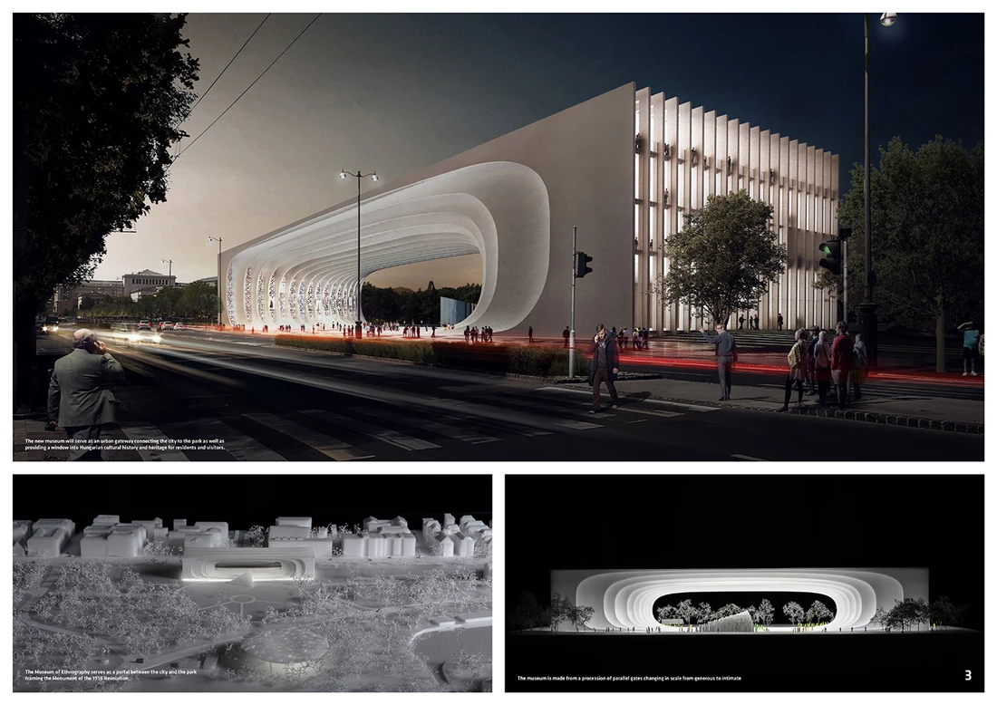Junto a la Casa de la Música Húngara de Sou Fujimoto y la Galería Nacional-Museo Ludwig de SANAA, que se construirán dentro del futuro complejo cultural Liget, a las afueras de Budapest, se levantará un nuevo museo etnográfico en la ciudad según la propuesta del estudio Napur Architect. La firma húngara —liderada por István Ferencz, Marcel Ferencz y György Détári— ha sido seleccionada frente a los otros equipos finalistas del concurso, entre los que se encontraban Bernard Tschumi Architects, Coop Himmelb(l)au, Dominique Perrault Architecture, MVRDV, OMA y Zaha Hadid Architects, además de Sauerbruch Hutton y BIG - Bjarke Ingels Group, estos dos últimos ganadores del segundo y tercer premio, respectivamente. La propuesta vencedora propone una cubierta vegetal inclinada, concebida como un gran espacio público. El que será el primer edificio expresamente diseñado para la institución, con 144 años de historia, abrirá sus puertas en 2019. NAPUR architect