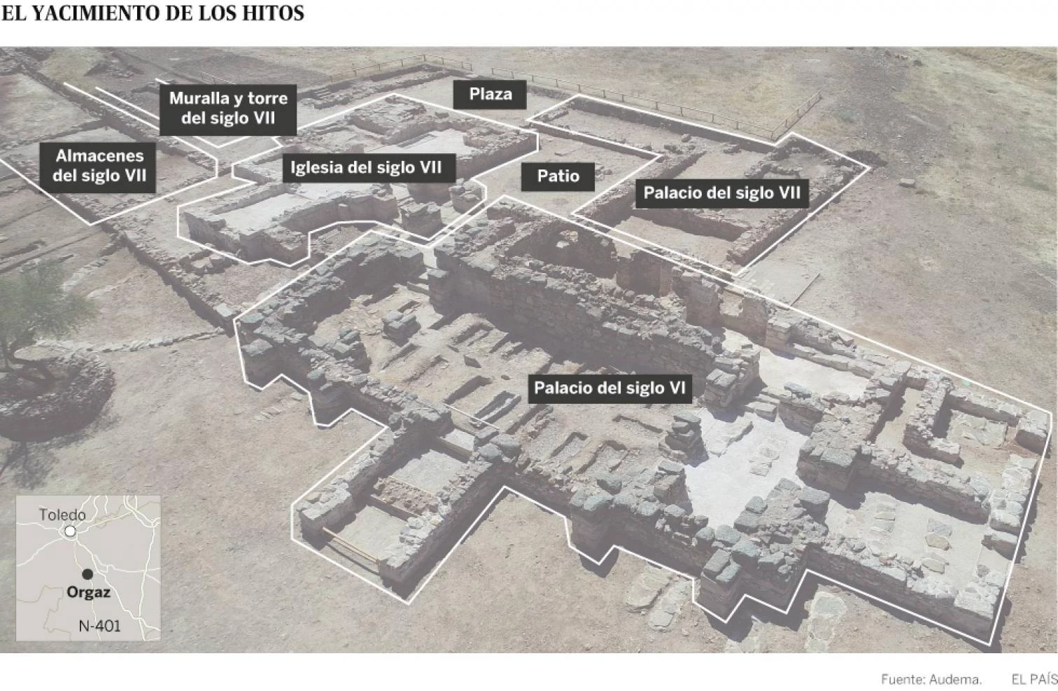 El trabajo de un centenar de científicos, historiadores y arqueólogos de universidades y centros de investigación de España, Reino Unido y Alemania, así como más de 6.000 peonadas, han logrado dar este año un vuelco espectacular al yacimiento de Los Hitos (Orgaz, Toledo). Lo que comenzó hace un siglo como una inagotable cantera a las afueras de la pedanía de Arisgotas, de la que los vecinos se llevaban las piedras para construir sus casas, ha terminado siendo, después de tres años de investigaciones, un desconocido complejo palatino visigodo fuertemente amurallado, no una iglesia aislada como en principio se pensó.