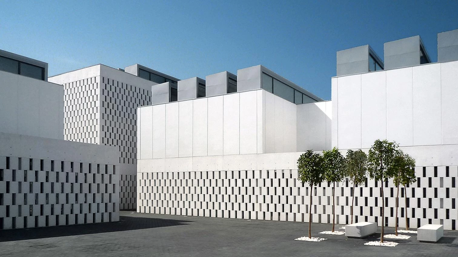 El Parque de Arte Sacro (véase AV Monografías 147-148) se inspira en el tradicional zoco mediterráneo para recrear la atmósfera propia de los antiguos barrios de los artesanos, donde, agrupados según los diferentes gremios, trabajaban y comerciaban con sus productos. Se trata de un conjunto de nueve edificios cuya relación permite crear un espacio urbano y público formado por un sistema de calles perpendiculares entre sí. En las intersecciones entre las calles surgen dos plazas de diferentes dimensiones, ornamentadas con naranjos, que pueden utilizarse para la eventual organización de mercados públicos o como área de descanso para los artesanos. Una envolvente continua formada por piezas prefabricadas de hormigón blanco envuelve los espacios de producción, modulados, flexibles e iluminados cenitalmente.