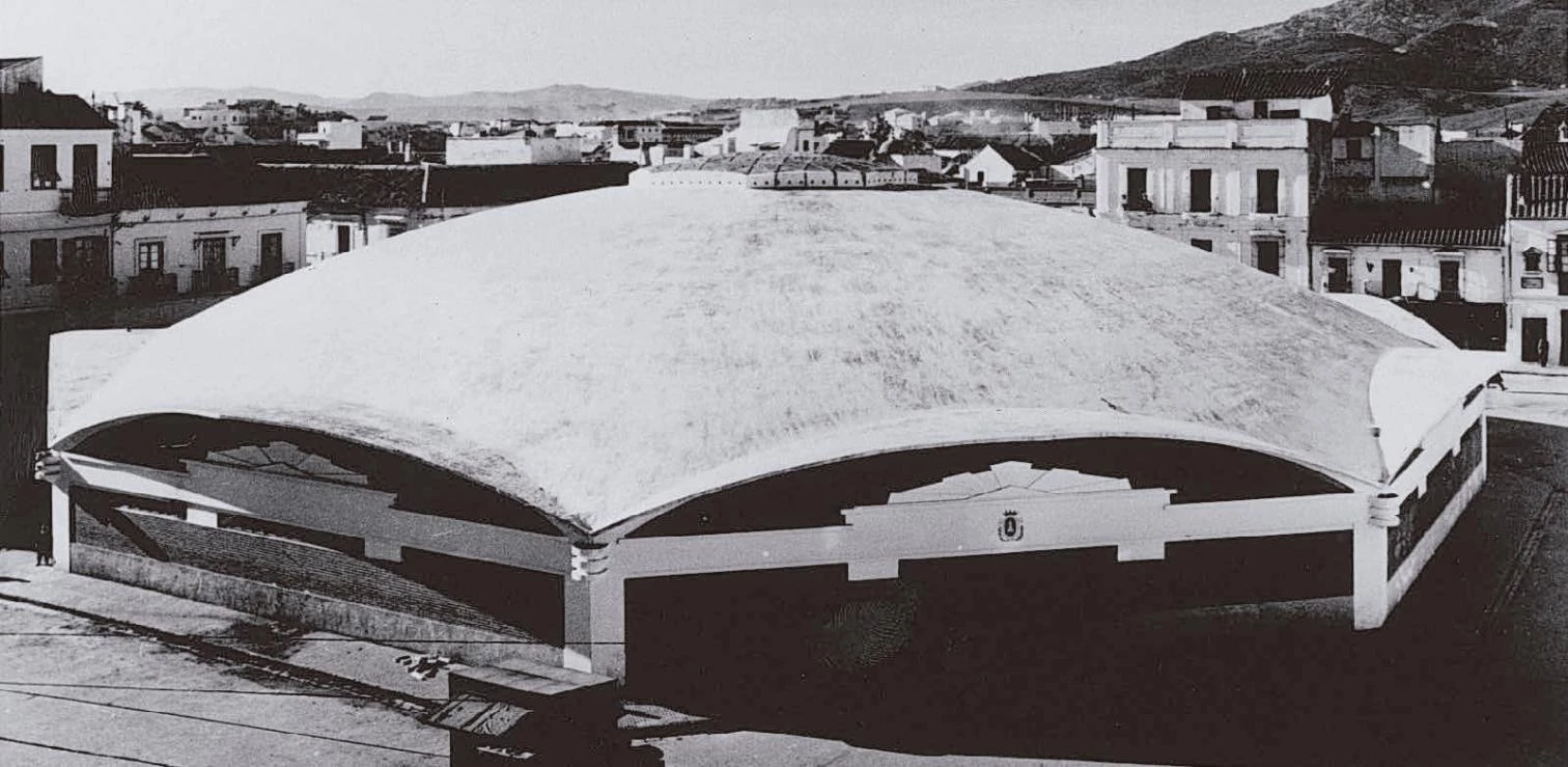 Una cúpula de casquete esférico en el mercado de Algeciras y una estructura laminar cilíndrica en el frontón Recoletos salvan grandes vanos sin apoyos intermedios.