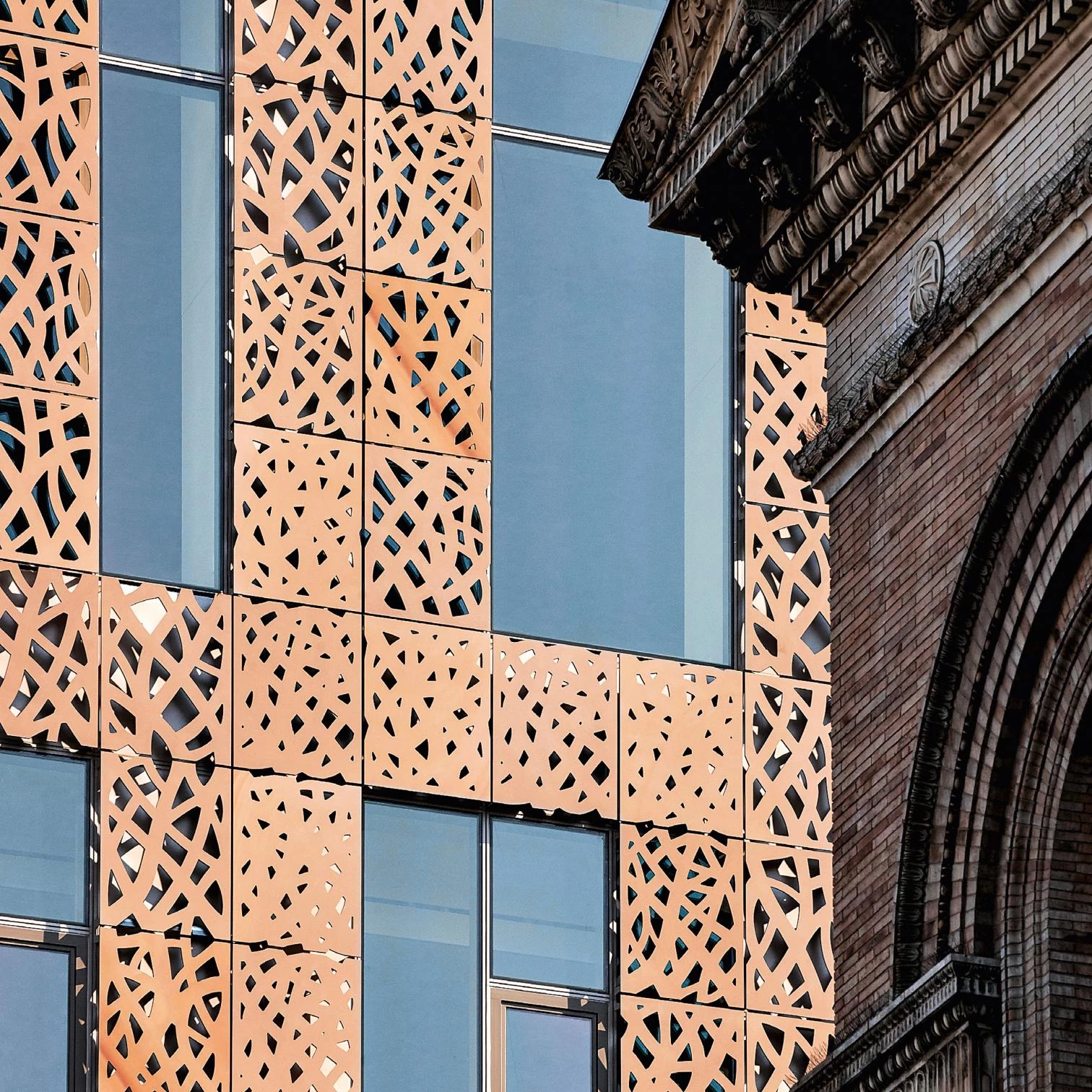 Desde el punto de vista técnico, la envolvente se ha resuelto con un singular revestimiento de paneles laminados de cuarcita, de reducido espesor (apenas 25 milímetros), formados por dos láminas adheridas fuertemente entre sí. Esta solución laminada permite conservar las características del material original (su tonalidad y su característico veteado), pero le dota de una alta resistencia mecánica, que es imposible de alcanzar en soluciones convencionales. Gracias al laminado, las piezas de cuarcita se pueden perforar con dibujos diferentes, con un alto porcentaje de huecos, para permitir la iluminación y las vistas, además de cumplir su función ornamental. Transformadas en paneles industrializadas, las piezas se fijan a los perfiles de acero de un sistema de muro cortina, que las separan unos diez centímetros de la hoja interior, creándose de este modo una cámara transventilada que mejora el rendimiento energético del conjunto de la envolvente.