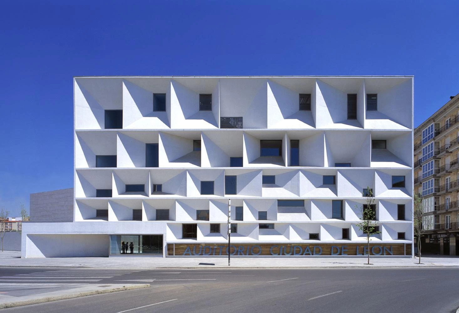 El Consejo Superior de Colegios de Arquitectos de España entrega cada dos años el premio de Arquitectura Española en reconocimiento a la mejor obra realizada en nuestro país. En su edición de 2003 esa obra ha sido el Auditorio de León, de los madrileños Luis Moreno Mansilla (1959) y Emilio Tuñón (1958). Colaboradores desde que eran estudiantes en el estudio de Rafael Moneo, obtuvieron el aplauso crítico desde su primera obra conjunta, el Museo de Bellas Artes de Zamora, encadenándose a continuación su victoria en los concursos para remo-delar como archivo y biblioteca la antigua fábrica de cervezas El Águila en Madrid, y para construir el Museo de Bellas Artes de Castellón. Obtenido igualmente mediante concurso en 1995, el Auditorio de León fragmenta su programa para no imponerse sobre el entorno. Si la sala de conciertos, rectangular y con butacas a ambos lados, es un homenaje al auditorio granadino Manuel de Falla, de José María García de Paredes, la fachada del centro de exposiciones es un eco plateresco de la iglesia de San Marcos. Formada por un monumental retablo de huecos abocinados de distintos tamaños, se ha convertido en la imagen emblemática del edificio.