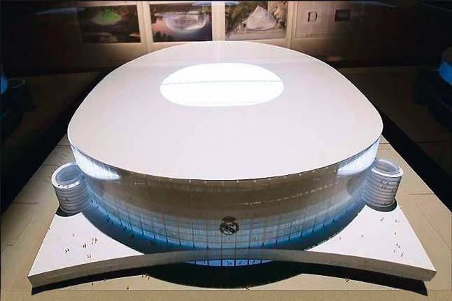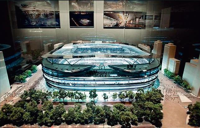 Por su parte, el proyecto de Norman Foster y Rafael de La-Hoz reorganiza el perímetro del estadio con una serie de plataformas anulares de gran transparencia visual, rematadas por una terraza-mirador y una espectacular visera que refleja hacia la calle las luces y colores del interior durante los partidos.
