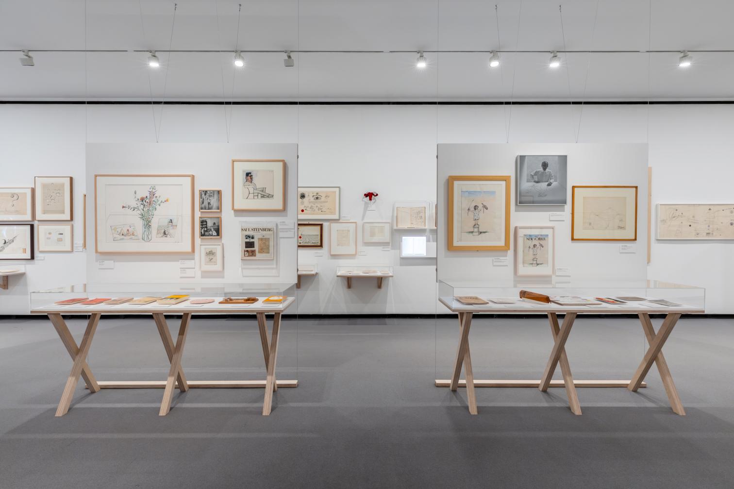 La museografía es resultado de un estrecho diálogo entre todos los integrantes del proyecto, donde también participan la obra de Steinberg y quienes de ella han escrito a lo largo del tiempo. Entre las nociones que influyen en el diseño espacial subyace la interpretación de su obra como un conjunto coherente hilado por temas y técnicas recurrentes a lo largo de su producción. En consecuencia, la museografía trata el total de piezas dentro de un único relato visual, a su vez, pautado en unas temáticas intemporales.