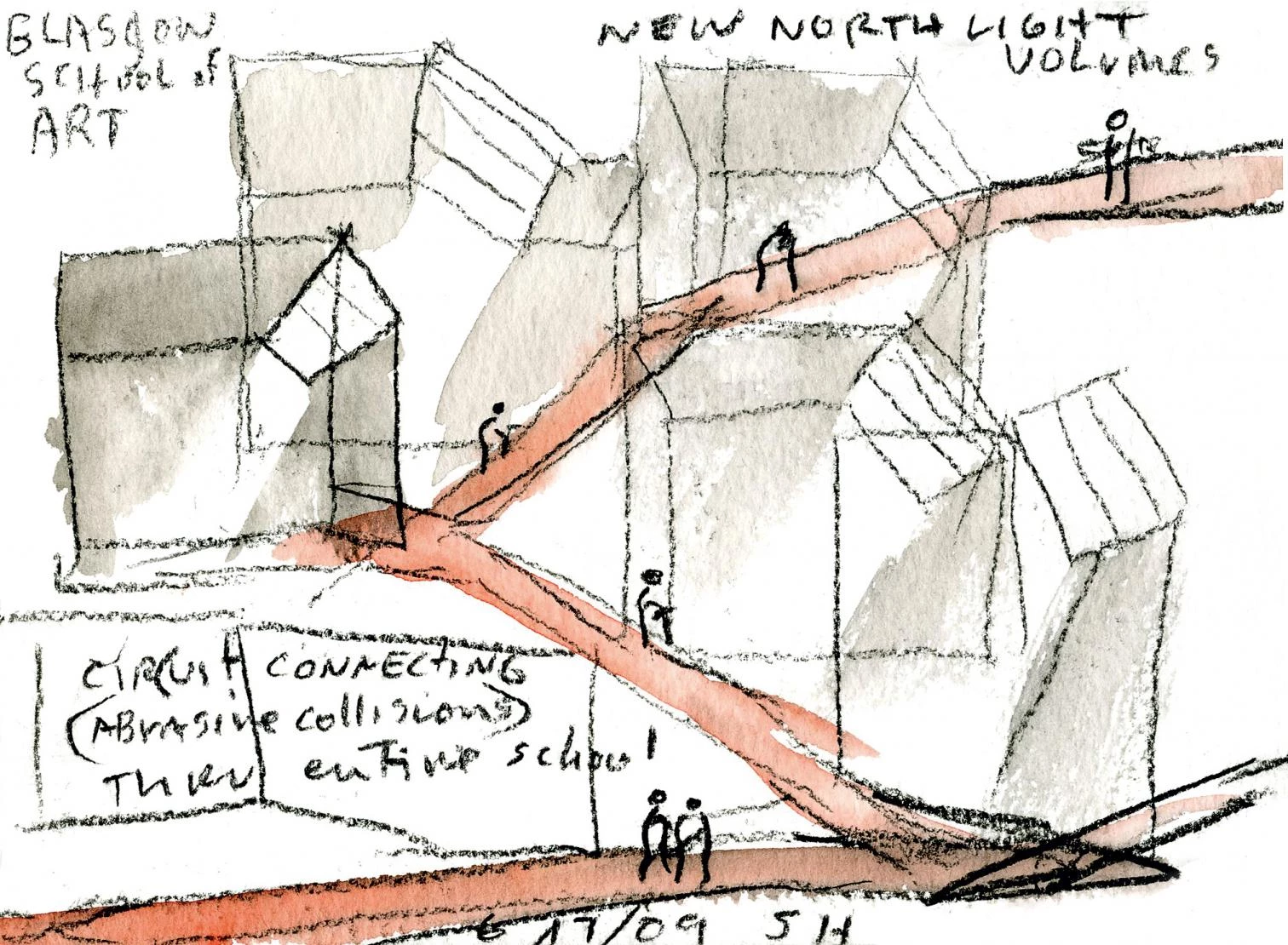 Charles Rennie Mackintosh (1868-1928) tenía sólo 28 años cuando ganó el concurso para diseñar la Glasgow School of Arts, su primer encargo, que construiría en dos fases entre entre 1897 y 1909, y que pasaría a ser su obra más importante. Cien años después, a fin de reestructurar la escuela, se ha convocado un concurso (véase AV Proyectos 34) en el que ha resultado ganador Steven Holl junto al estudio local JM Architects para el diseño de un primer edificio frente al del escocés, que será la primera obra del futuro campus, donde el edificio histórico ocupará un lugar central. El jurado seleccionó como finalistas otras seis propuestas: las de Francisco Mangado; los dublineses Grafton; Elder y Cannon, de Glasgow; y tres londinenses: John McAslan; Michael Hopkins; y Benson y Forsyth. Más de 150 estudios participaron en el concurso, entre ellos los de Zaha Hadid, Richard Rogers, David Chipperfield y Nicholas Grimshaw.