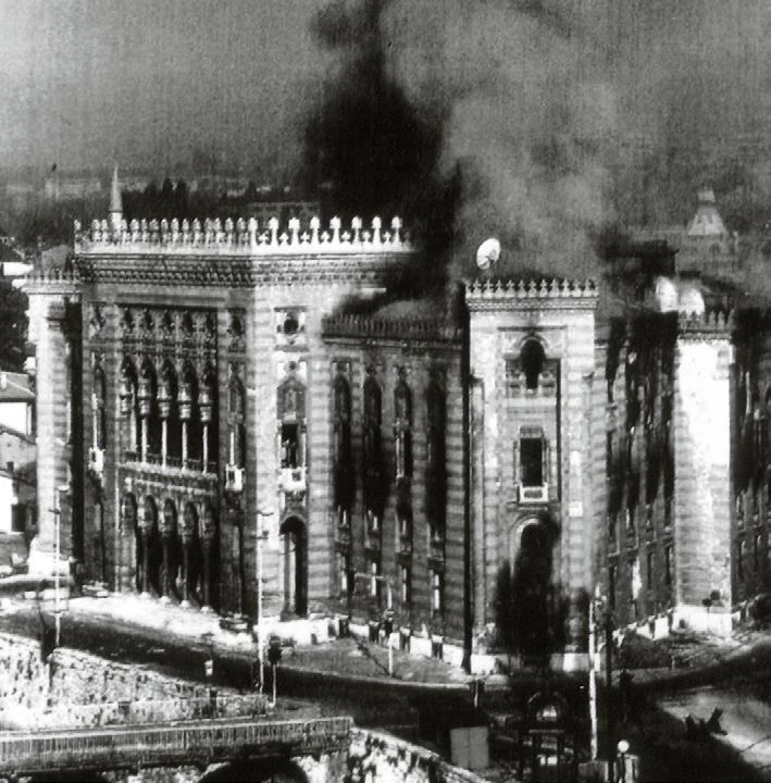 La destrucción de la Biblioteca Nacional de Sarajevo fue uno de los acontecimientos más dramáticos de la guerra, e hizo de sus ruinas un símbolo del genocidio cultural sufrido por la antigua Yugoslavia.