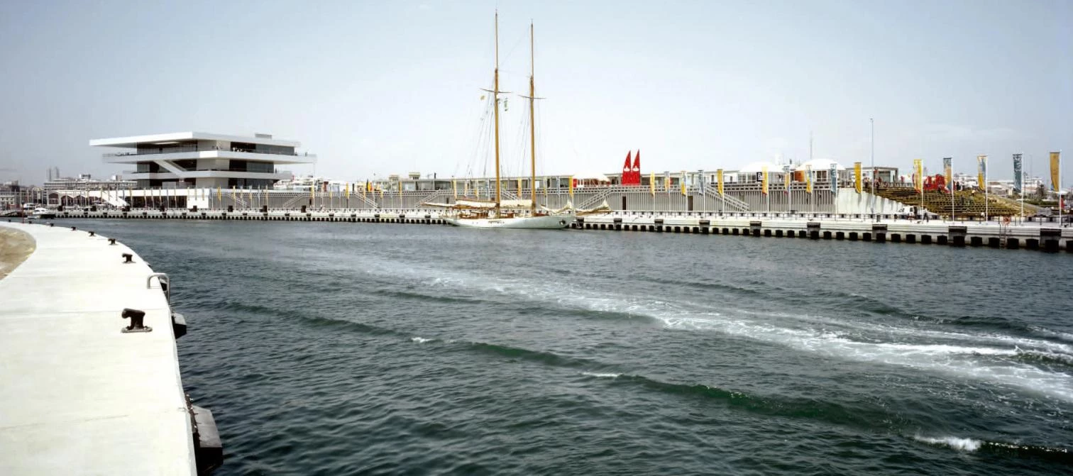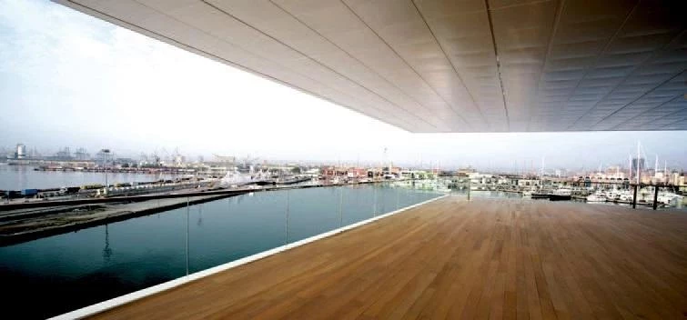El Foredeck de Chipperfield y b720 (denomina-do también Veles e Vents en homenaje a un poema de Ausiàs March), que los arquitectos ganaron en concurso frente a competidores como Jean Nouvel, Von Gerkan y Marg, Carlos Ferrater o Alejandro Zaera, es un edificio mirador formado por cuatro grandes plataformas que se levantan con aplomo escultórico en el extremo de la dársena, y que se ex-tienden a lo largo del nuevo canal con un aparca-miento de 800 vehículos y un paseo ajardinado que enlaza este hito del puerto deportivo con el frente marítimo y la playa de la Malvarrosa: «la playa de Sorolla y de Blasco Ibáñez», como la describe la alcaldesa Rita Barberá mientras almorzamos en Las Arenas, un gran hotel nuevo de estilo clasicista que ofrece un contrapunto de opulencia a las geo-metrías depuradas del Foredeck, donde la gravitas de la obra de Chipperfield se disuelve en la claridad mediterránea de los grandes voladizos, forrados de acero esmaltado en blanco que los hace parecer in-grávidos; una impresión acentuada por la transparencia del cuerpo principal y los casi imperceptibles petos de vidrio del perímetro.