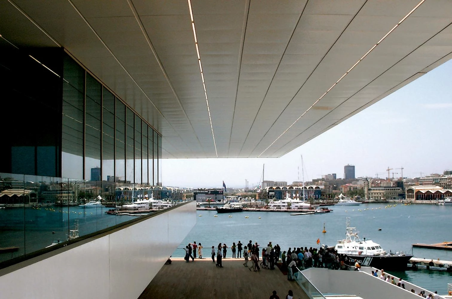 El Foredeck de la Copa América, bautizado como Veles e Vents, se forma con varias plataformas en voladizo que enmarcan las vistas y protegen del sol a espectadores y visitantes, alzándose en el muelle como un hito abstracto.