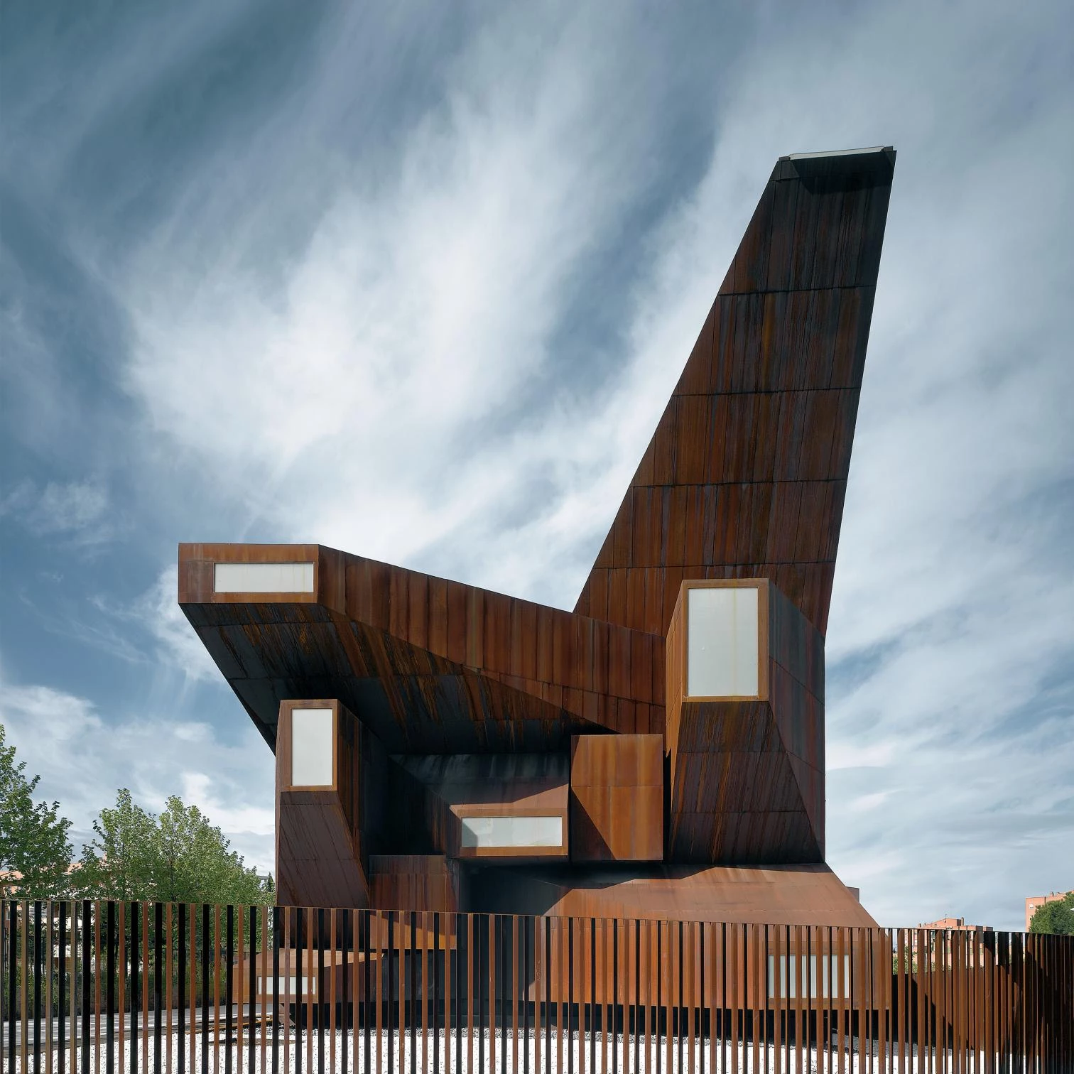 En el municipio madrileño de Rivas Vaciamadrid se ha consagrado el centro parroquial de Santa Mónica, obra de Ignacio Vicens y José Antonio Ramos cuyo volumen expresionista en acero cortén contrasta subversivamente con el continuo de unifamiliares que la rodea. De planta alargada y direccional —a pesar del deseo de los autores, que elaboraron dos proyectos previos, desestimados por el obispado de Alcalá de Henares—, la iglesia ocupa una parcela difícil por su estrechez, donada por la familia Corsini. La parroquia ha sido escogida por la revista de tendencias Wallpaper* como ‘mejor iglesia de 2008’, pues tras su exuberante frontal ofrece un interior sereno, litúrgicamente impecable, en el que brillan notables piezas de arte sacro como el escueto crucifijo de bronce del académico de Bellas Artes José Luis Sánchez, la pintura abstracta de la Creación en la capilla del Santísimo de José Manuel Ciria, o las esculturas figurativas del joven videoartista Javier Vivier flotando en un retablo de luz y pan de oro.