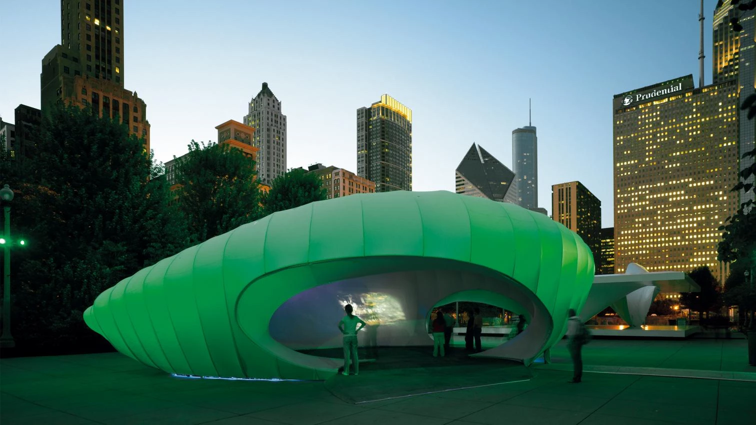 Con ocasión del centenario del Plan de Chicago de 1909—un influyente diseño de Daniel Burnham y Edward Bennett para la reforma del trazado de la ciudad—, el estudio de arquitectura de Zaha Hadid y los holandeses UNStudio han construido sendos pabellones temporales en el Millennium Park, a orillas del Lago Michigan. La estructura de Hadid (en primer plano) utiliza la geometría curvilínea para definir una sofisticada cápsula textil con proyecciones en su interior. UNStudio, por su parte, propone una cubierta plegada desde la que se aprecian espectaculares vistas del perfil urbano (en el fondo de la imagen).
