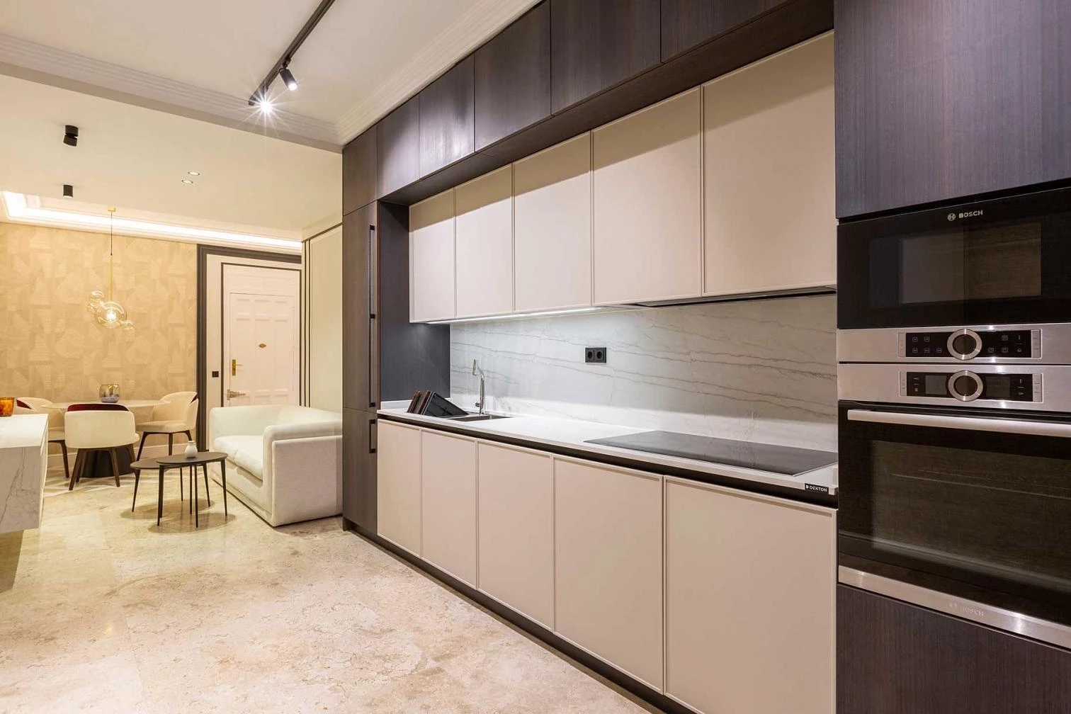 Destaca también el elemento de la isla central diseñada con la puerta Varese con sistema de apertura gola, en acabado Oro Gratta, solo ubicado en el borde superior. La encimera modelo Lucid de la serie Onirika de Dekton aporta luminosidad y elegancia al diseño. También, cabe resaltar las molduras en las esquinas en roble macizo que estilizan y suavizan su volumen.