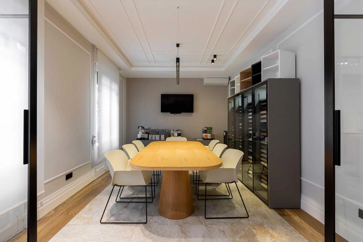 Junto a la Cocina Chicago se encuentra un espacio para reuniones que cuenta con todas las comodidades, muestrarios y catálogos necesarios para que el equipo de BC3 Cocinas reciba a los profesionales del sector del diseño y la arquitectura para satisfacer las necesidades de los mismos y dar las mejores soluciones para los proyectos.