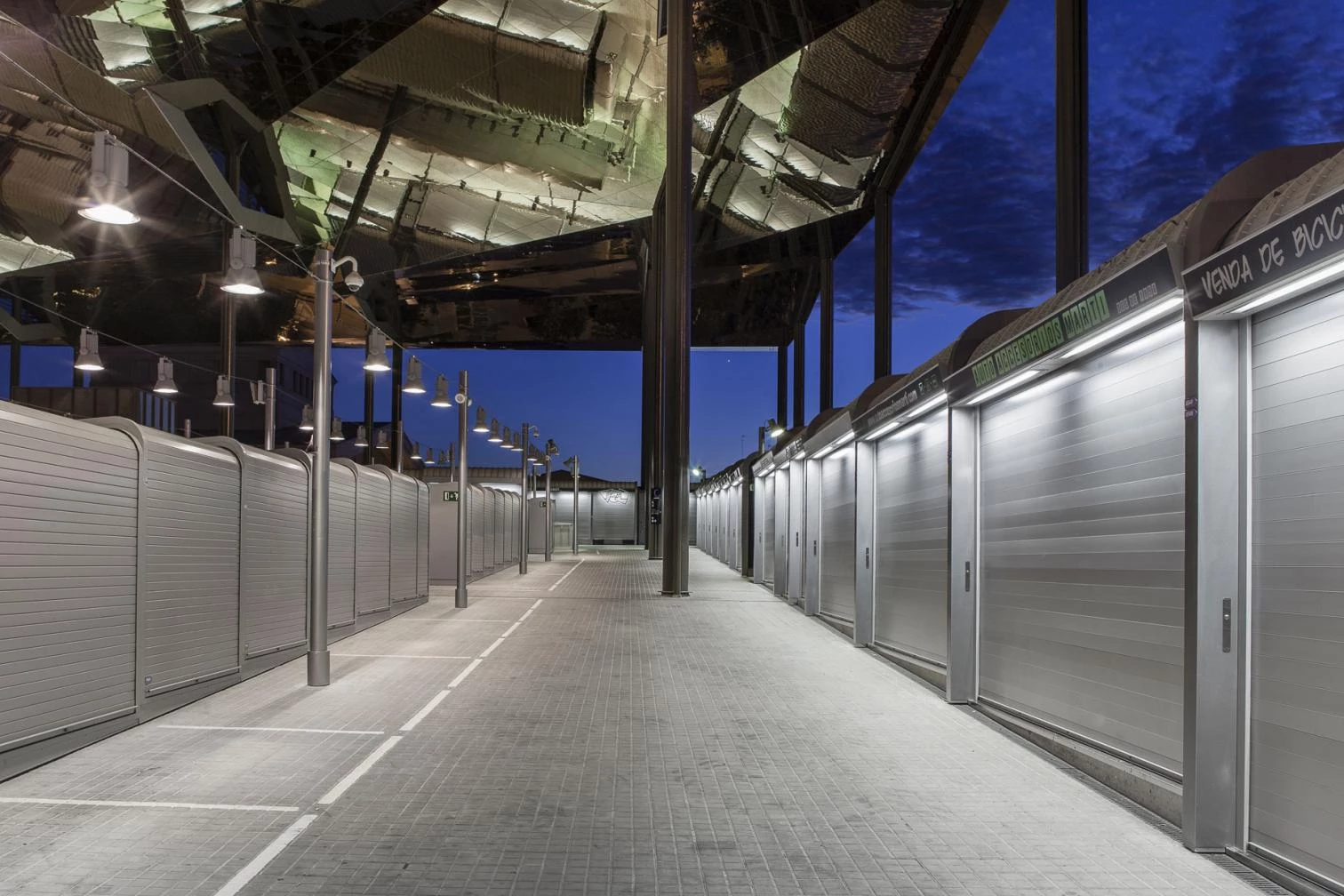 La iluminación general se resolvió mediante proyectores con óptica vial, instalados a 4 metros de altura en la planta superior y a 8 metros de altura en planta baja, junto con una serie de proyectores de óptica concentrada orientados hacia la zona central de la plaza, asegurando un buen nivel de uniformidad. Una segunda capa lumínica aportaba iluminación específica en los puestos de venta, a través de luminarias lineales integradas en la propia estructura de los puntos de venta.