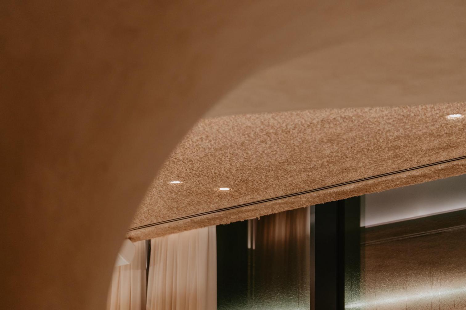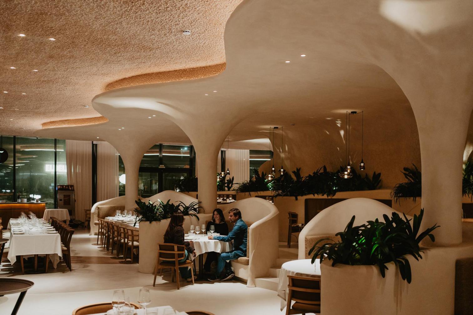 Los paramentos verticales del restaurante están revestidos con mortero de cal proyectado sobre mantas de cañizo, mientras que los techos acústicos se basan en un proyectado de celulosa. Además, el uso de madera de pino radiata en las estructuras ocultas permite aligerar peso y masa en todo el volumen. "Cada uno de los materiales y demás elementos utilizados han sido cuidadosamente seleccionados para reducir la huella de carbono y teniendo en cuenta los volátiles y formaldehidos, la durabilidad y el mantenimiento, para así garantizar el mínimo impacto ambiental posible. Nuestro objetivo ha sido crear un espacio que no solo sea visualmente atractivo, sino también responsable", comenta el diseñador. Y es aquí, dado que el proyecto ha sido diseñado teniendo en cuenta criterios medioambientales rigurosos, donde Lamp también ha jugado un papel clave al proporcionar soluciones lumínicas que complementan la apuesta por la sostenibilidad en todas las fases del proceso.