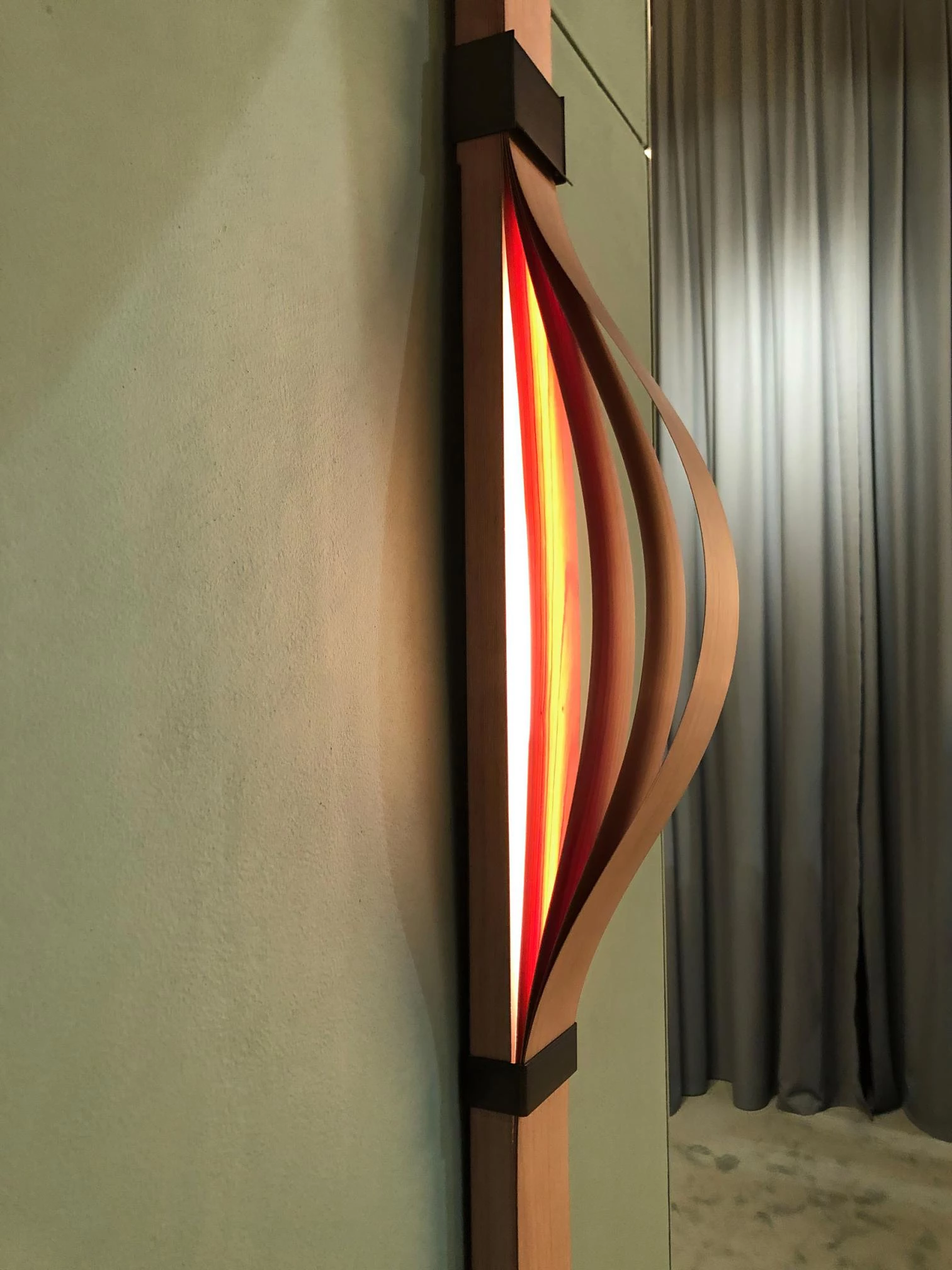 De elaboración artesanal, las láminas flexibles se ajustan utilizando hebillas que controlan la intensidad de la luz que se emana desde el centro de la lámpara. Su diseño, versátil y flexible, permite que se adapte tanto a lámpara colgante, de techo o de pared, creando atmósferas cálidas y acogedoras que generan distintos ambientes; y apagada se convierte en una pieza escultórica.