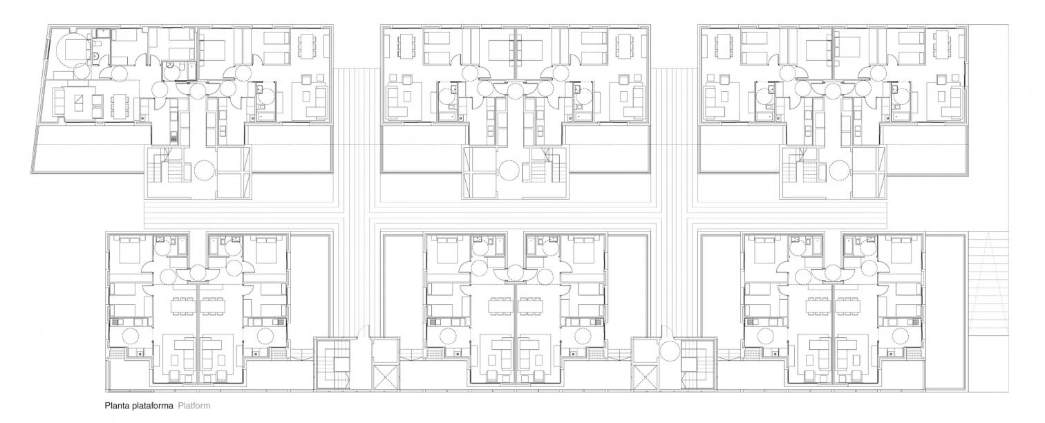 En planta baja, un local comercial autónomo, vinculado a la primera planta de aparcamiento, ofrece a la ciudad una fachada de materialidad continua que a su vez recogerá salidas de evacuación, instalaciones, ventilaciones… El acceso peatonal a las viviendas se hace a través de dos núcleos centrales de comunicación, con frente a la avenida, enrasados con la línea de fachada. Estos núcleos conectan el nivel de la ciudad con el nivel de la plataforma superior, comunicados con una calle peatonal interior que, a través de patios y recorridos ajardinados conduce a la zona comunitaria posterior. Desde cada núcleo vertical se accede a 36 viviendas pasantes con terraza, del orden de cuatro viviendas por planta, con un total de 108. Existen un total de 91 viviendas de tres dormitorios y catorce de dos dormitorios, incluyendo viviendas adaptadas para personas con movilidad reducida.