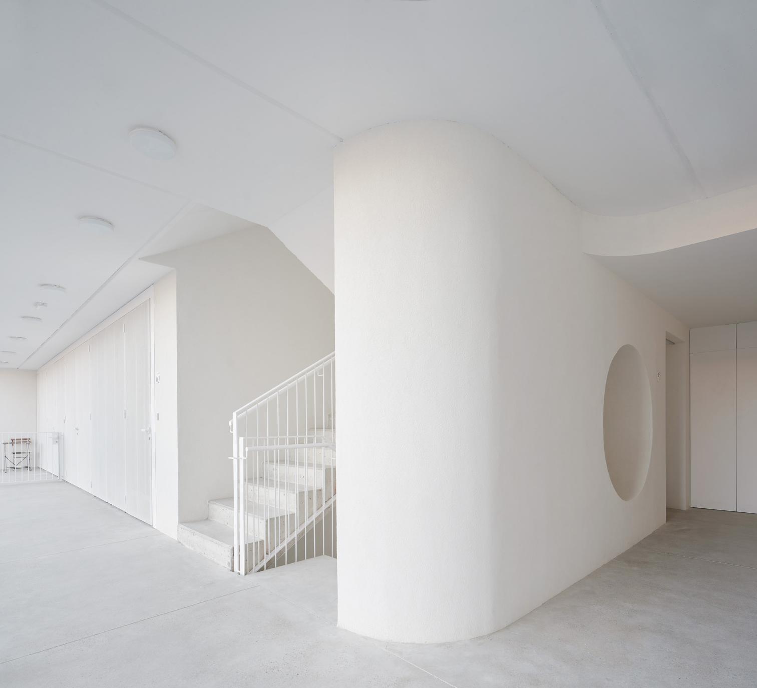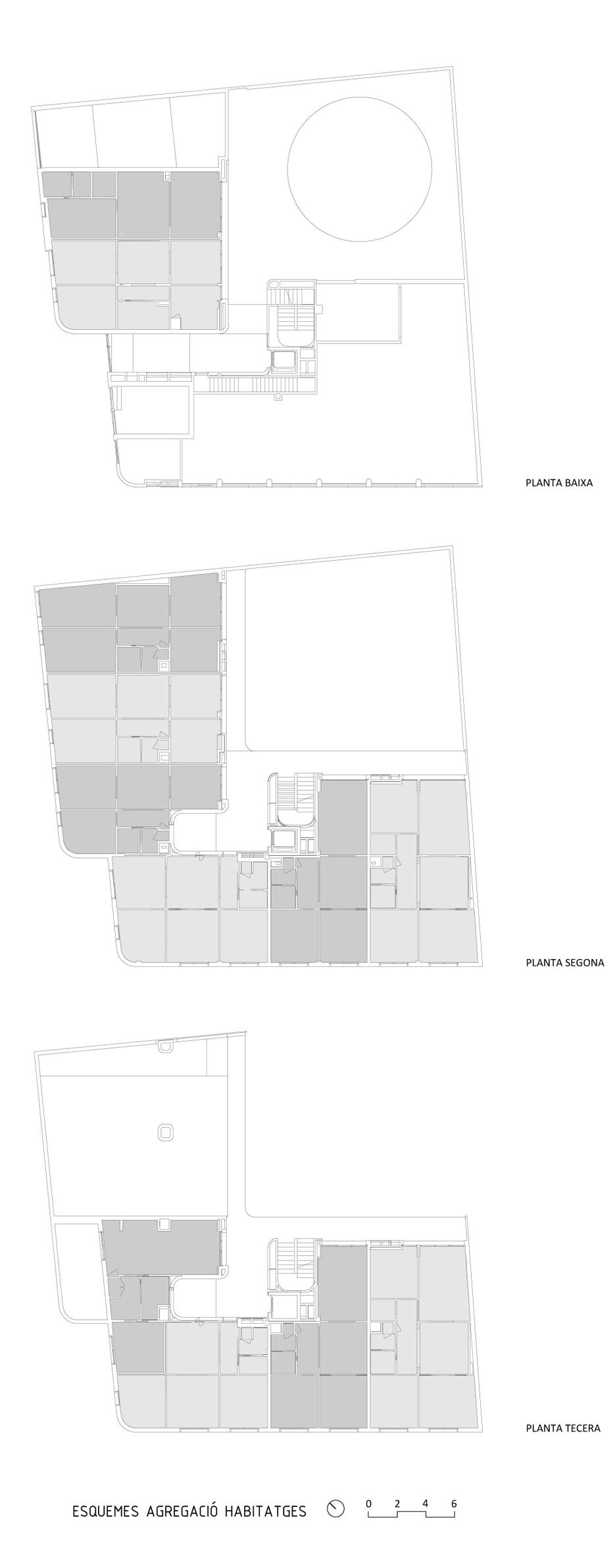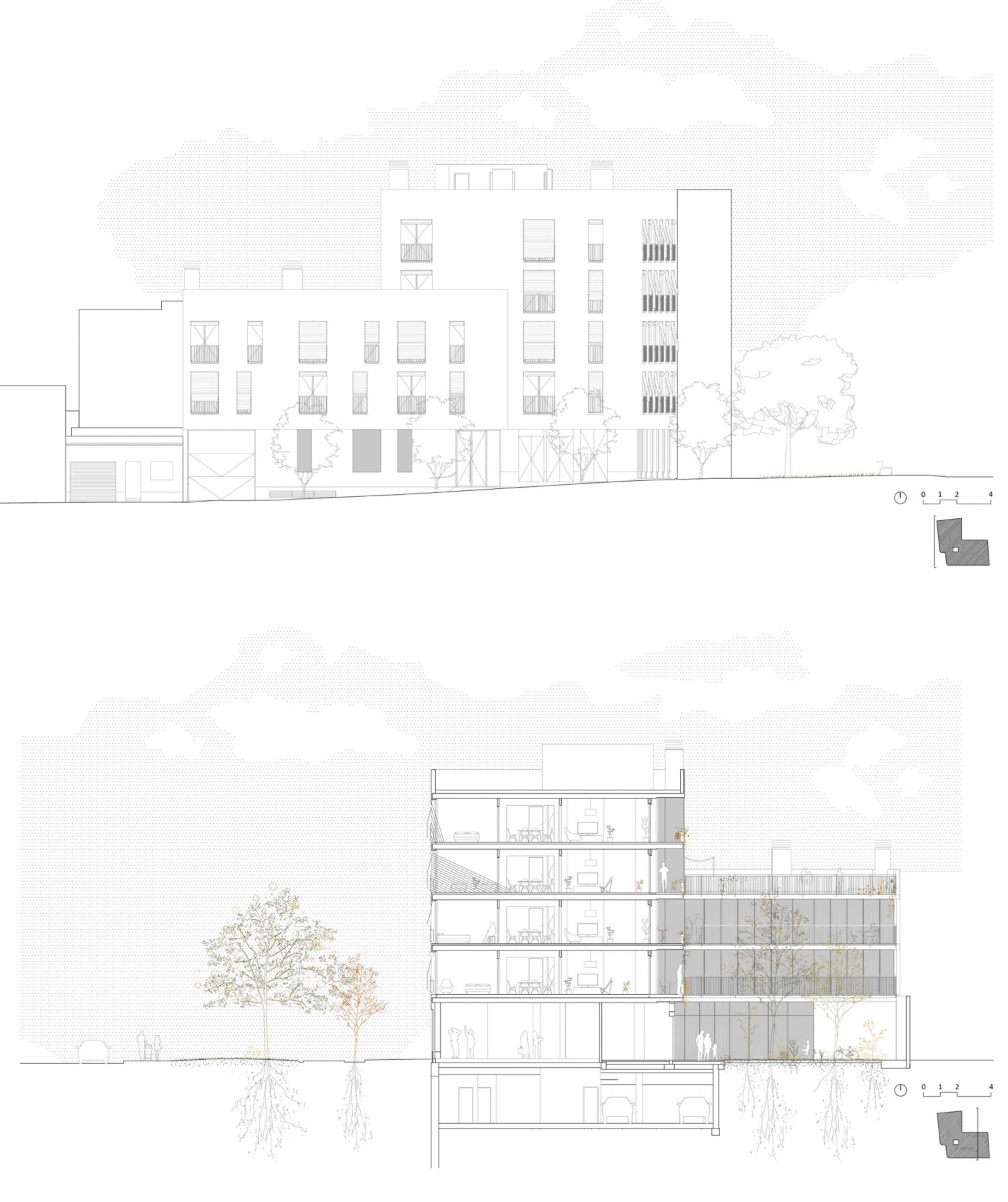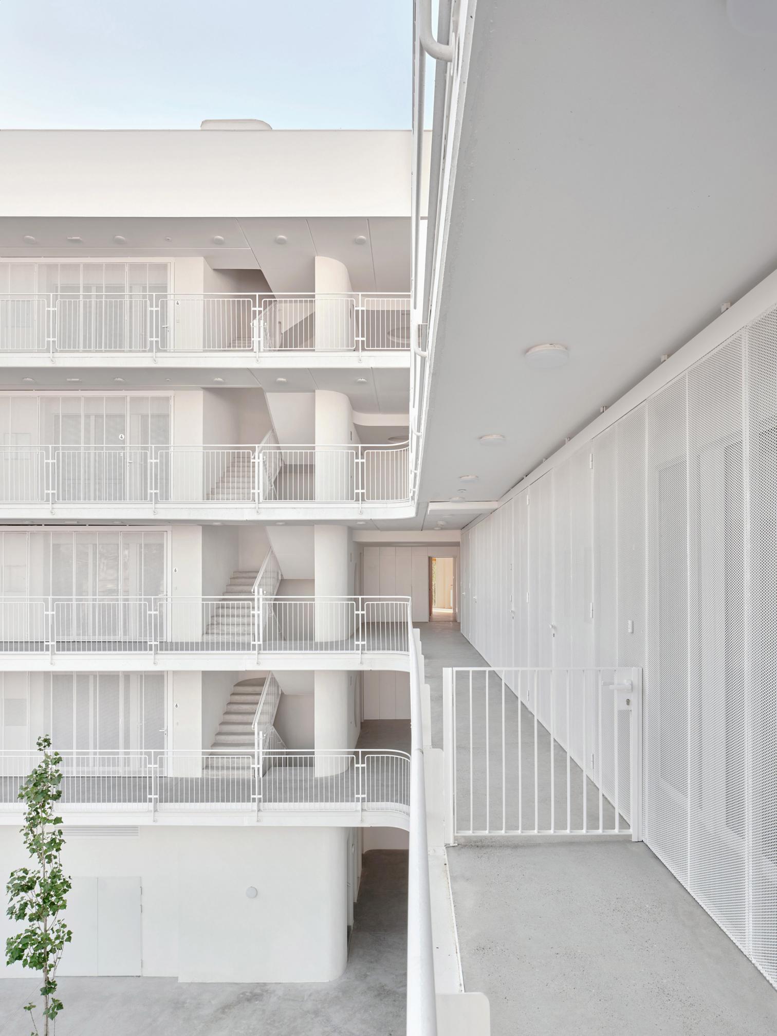 Las viviendas, cuyas superficies oscilan entre 50 y 80 metros cuadrados, se organizan en torno a un jardín comunitario en planta baja que, junto con una terraza compartida en la tercera planta, fomenta la vida en comunidad. El acceso a las viviendas se realiza a través de pasarelas exteriores que actúan como corredores abiertos, promoviendo la ventilación natural y el contacto social.