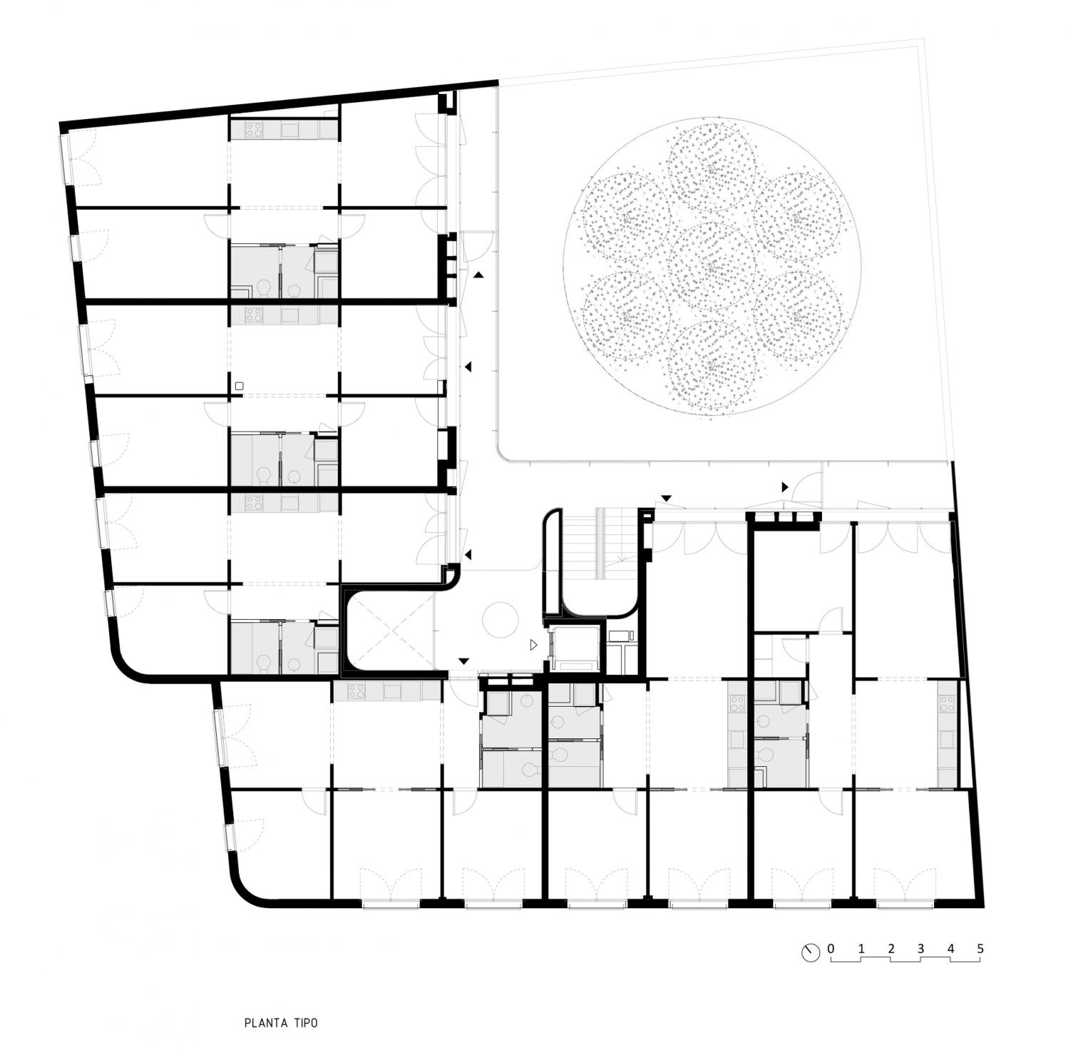 Uno de los elementos que definen el proyecto es su estructura prefabricada de losas alveolares de hormigón pretensado. Este sistema permite una planta libre con una distribución flexible gracias a una estructura de grandes luces y un núcleo central de servicios. Esta configuración libera las fachadas, asegurando dobles orientaciones que optimizan la entrada de luz y la ventilación cruzada natural en todas las viviendas.