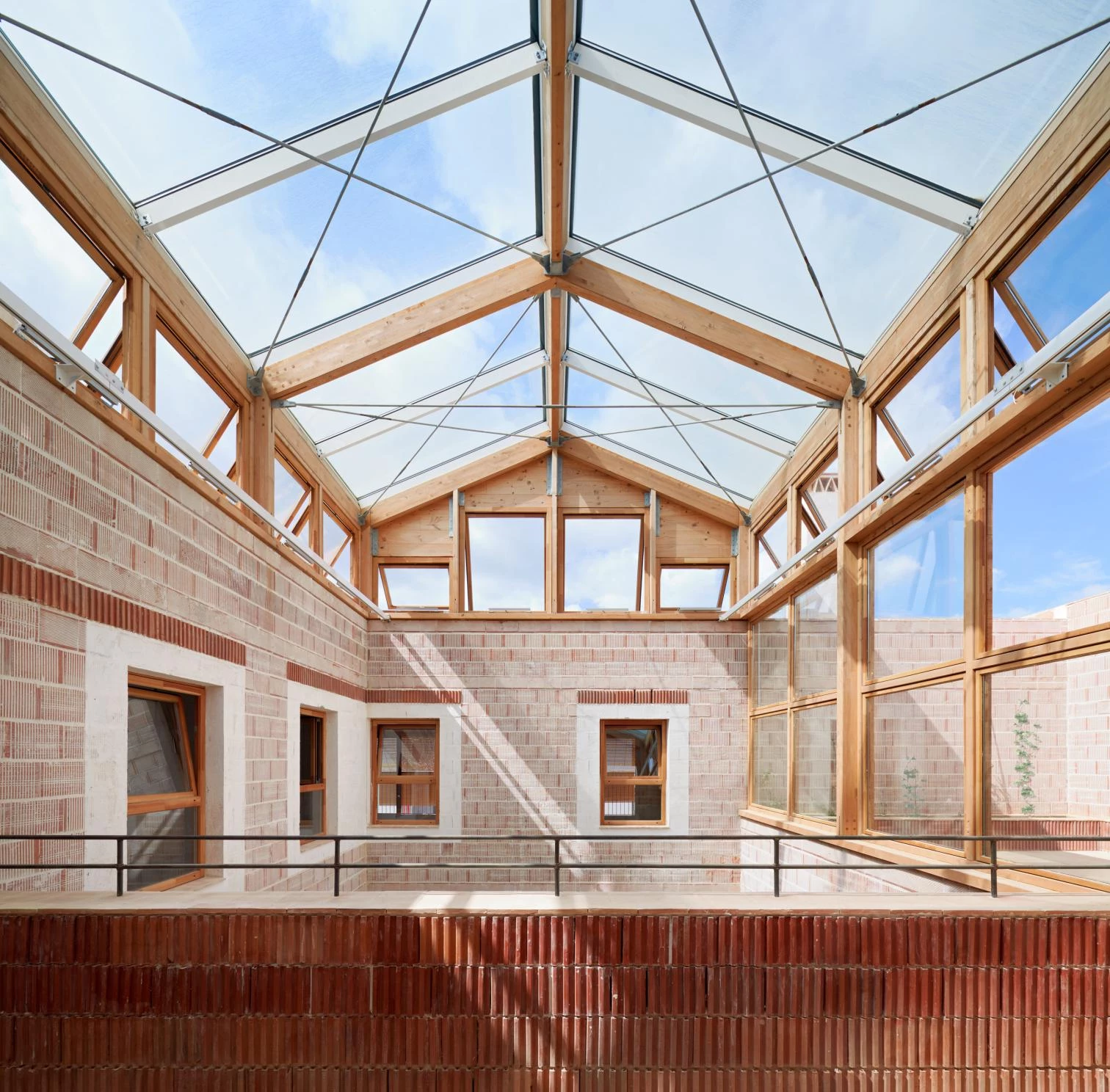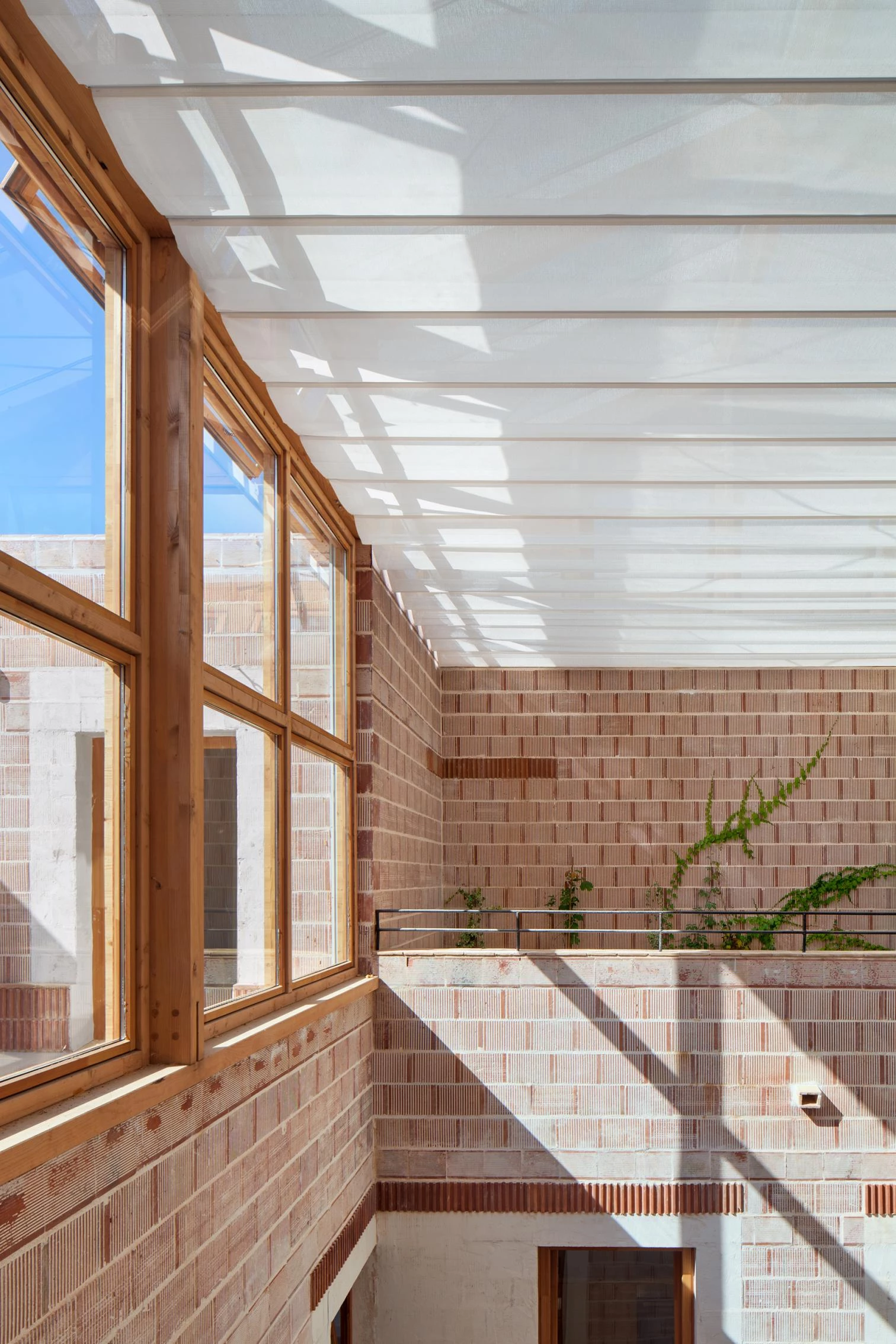 Con una superficie construida de 2.596 metros cuadrados, el volumen aislado de cuatro alturas agota casi toda la ocupación y edificabilidad de la parcela de 43x43 metros, situada a unos 5 metros por encima del nivel del mar y girada 45º con respecto a los ejes cardinales. La organización en torno a cuatro patios permite que todas las salas y dormitorios obtengan doble orientación.