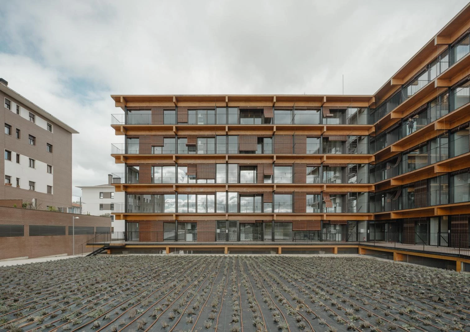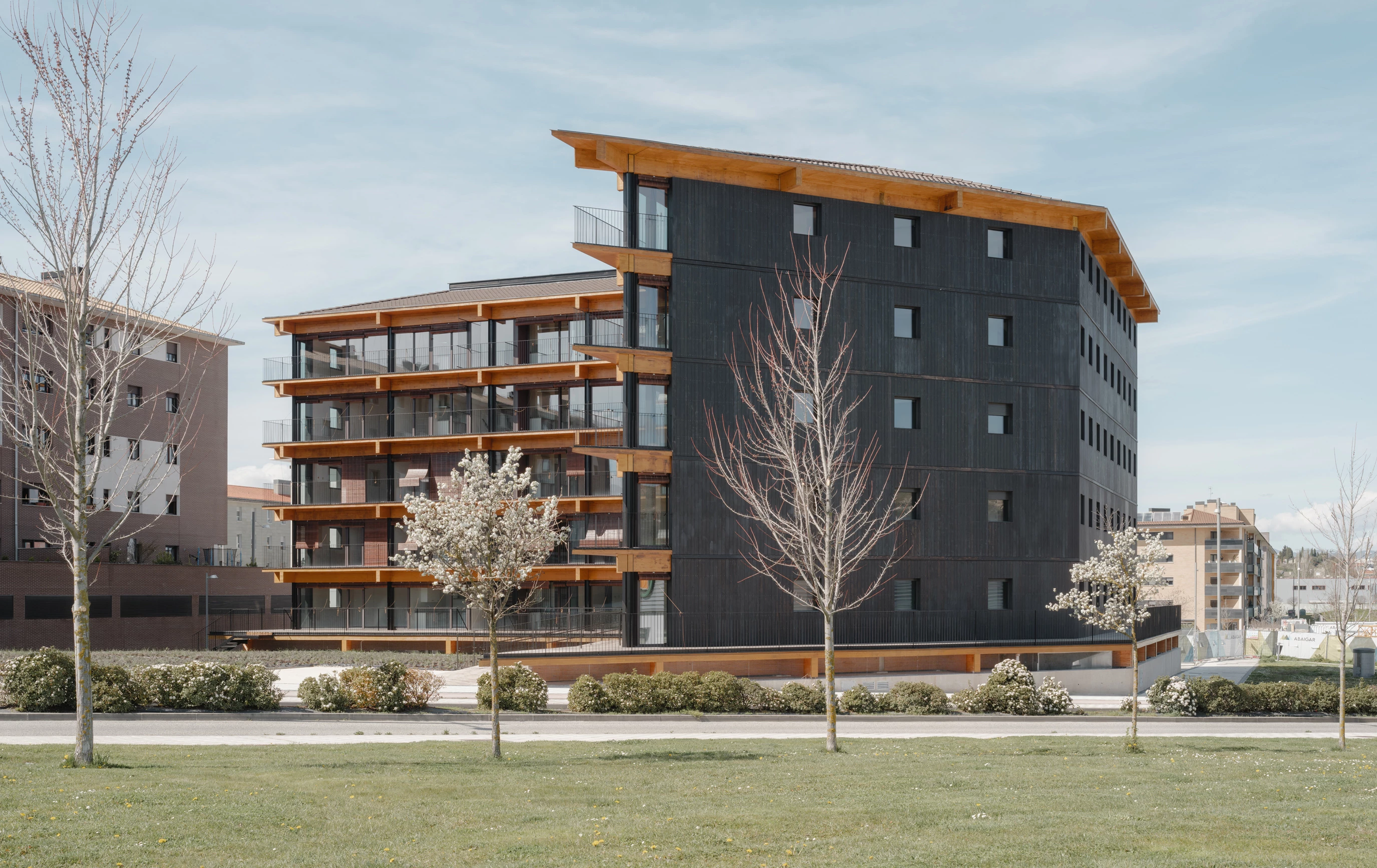 En Mutilva, localidad navarra del municipio de Valle de Aranguren, se encuentran estas viviendas sociales. El volumen residencial en forma de L se abre para disfrutar de las vistas al paisaje, protegiéndose a su vez de los vientos del norte.