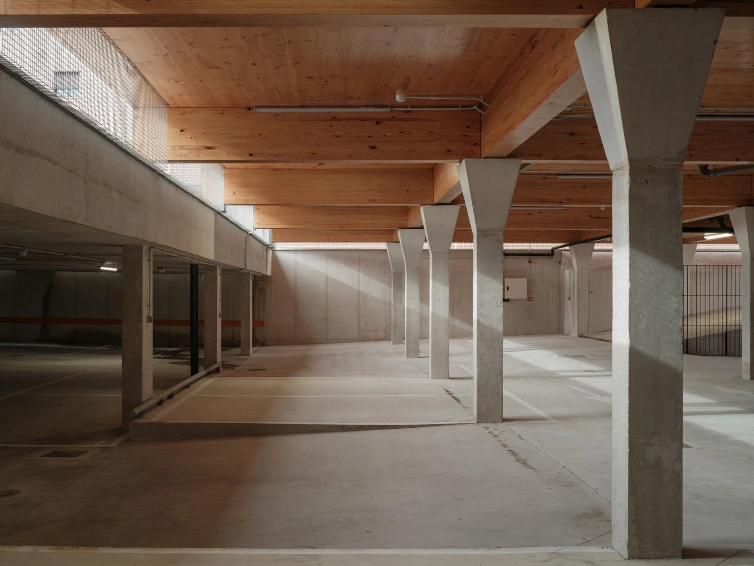 El desnivel de la parcela configura el acceso común a las viviendas y el primer balcón, que es el de mayor tamaño. La diferencia de nivel en el extremo norte de la calle se convierte en la entrada al garaje, que combina hormigón y madera.