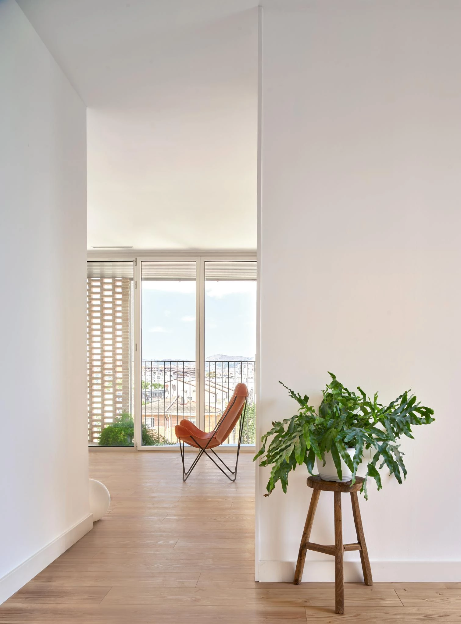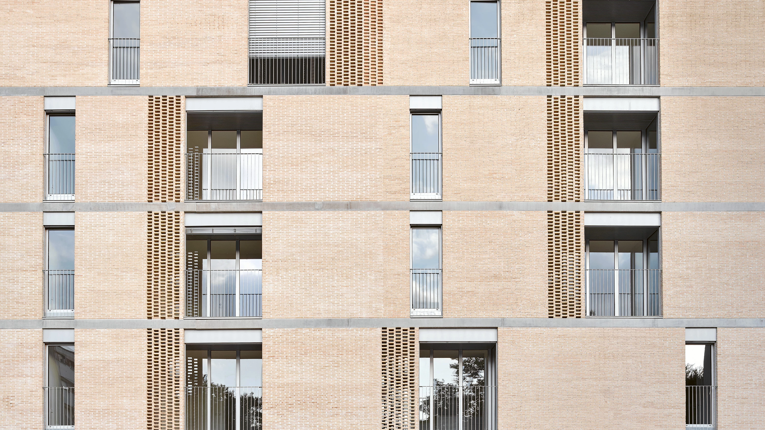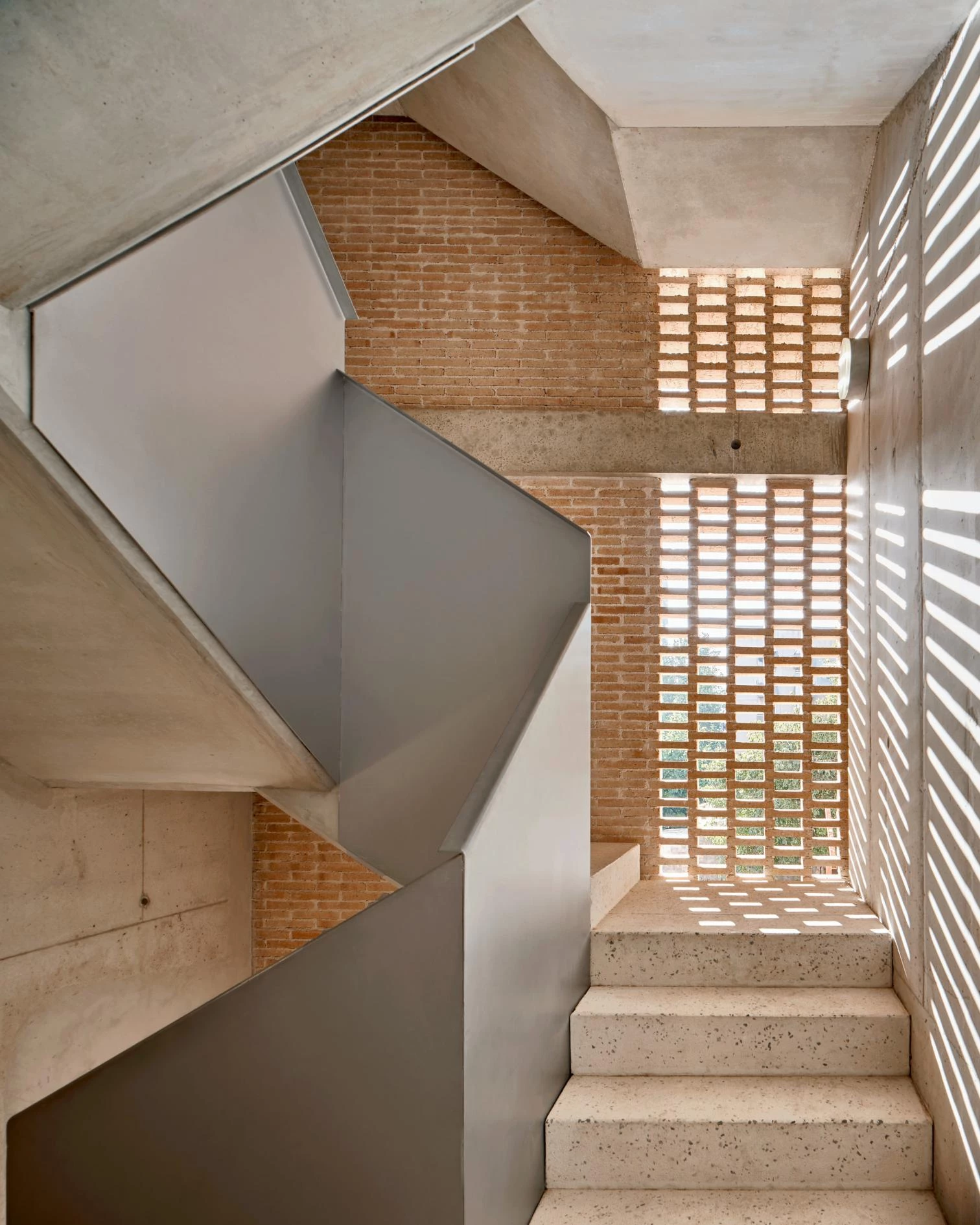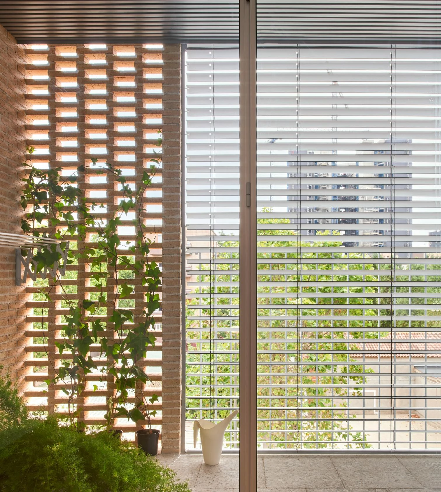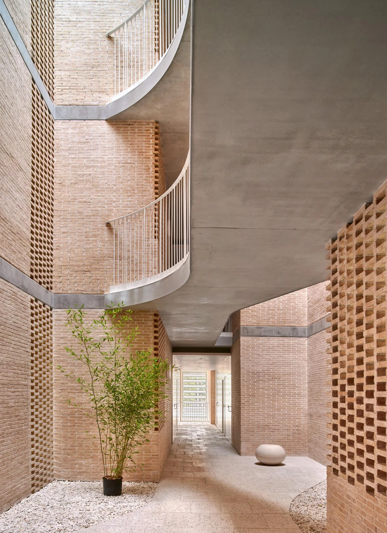 Los ladrillos artesanales y cocidos con biomasa aportan inercia al vacío interior —que actúa como captador o como chimenea solar según la estación—, y se aparejan formando celosías por las que ventilan los apartamentos.
