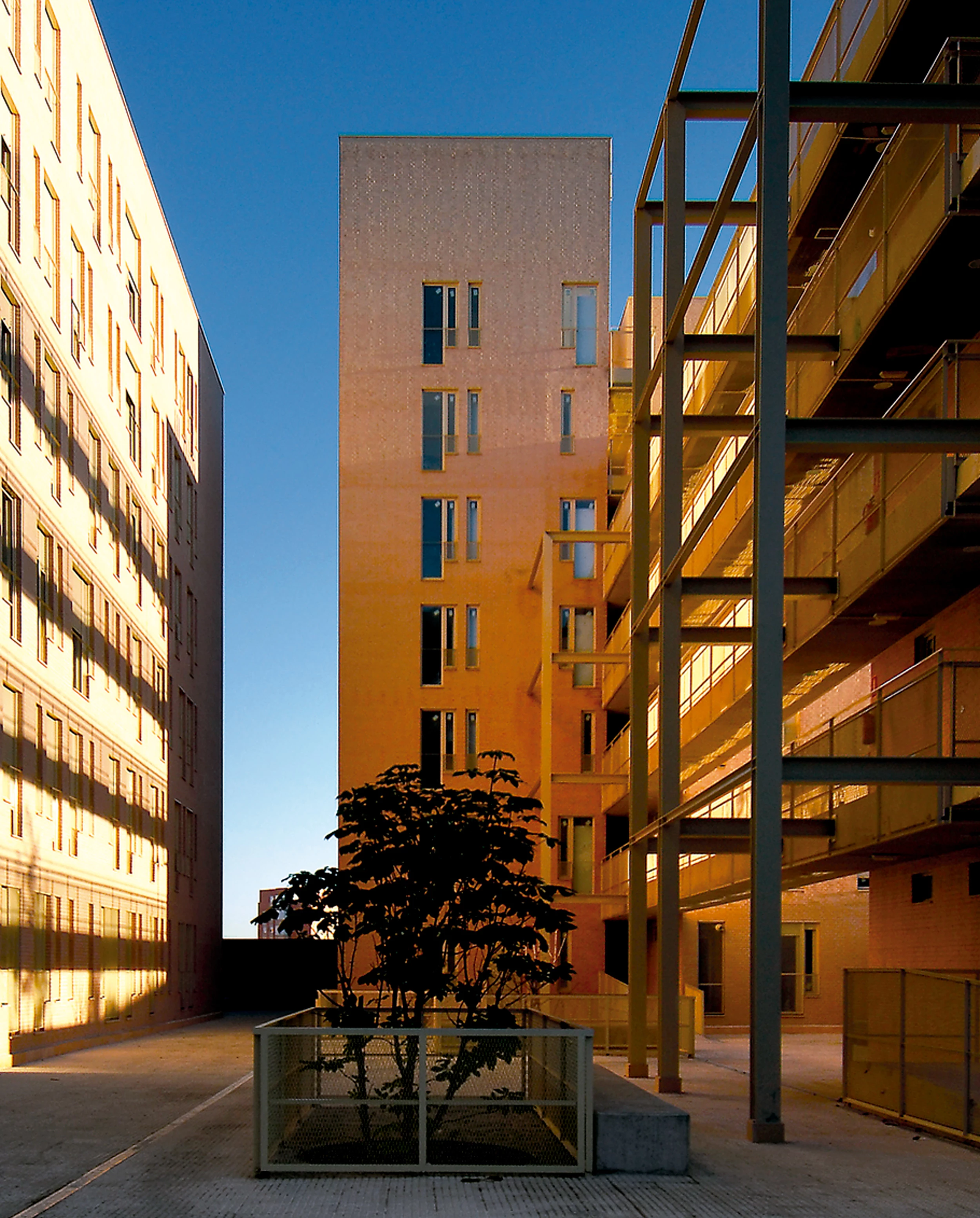 Los bloques lineales se disponen en paralelo sobre la manzana, liberando estrechas franjas horizontales que actúan como espacios comunes ajardinados. Los paños de fachada juegan con diversas texturas y tonalidades sobre las que se recortan limpiamente pequeños huecos de proporción vertical que se alternan con galerías metálicas... [+]