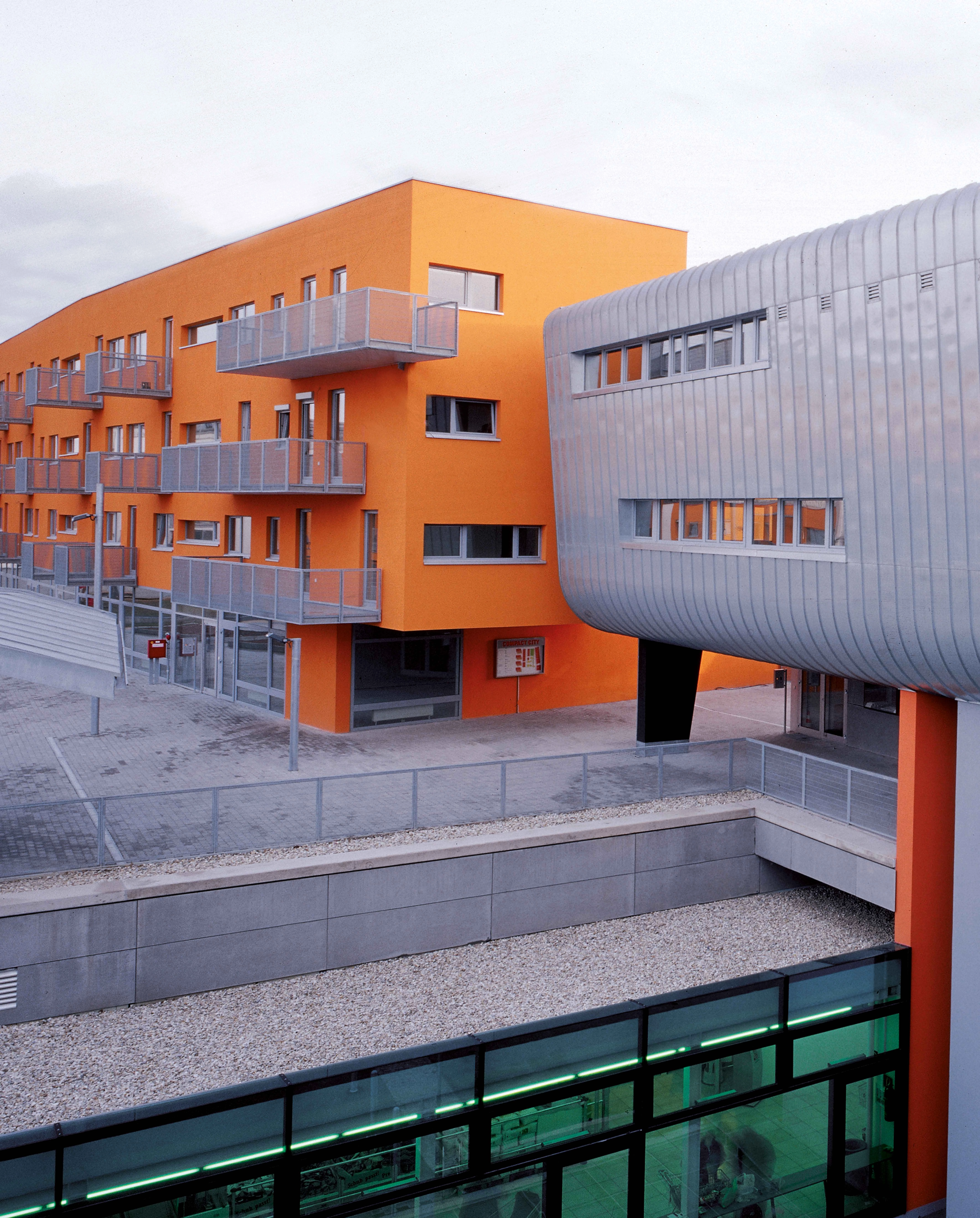 En esta placa urbana se cimentan las estructuras que albergan tipologías híbridas de viviendas y espacios de trabajo. Sobre uno de los lados del cuadrilátero, talleres, oficinas y apartamentos se agrupan en cuatro volúmenes de ventanas rasgadas y comunicaciones horizontales en galerías exteriores. A continuación, y con una disposición de hilera tradicional de adosados, se sitúa un cuerpo destinado a albergar viviendas y estudios profesionales, con comunicaciones exteriores que repiten el esquema de galerías exteriores anterior. Como piezas sueltas y orquestando un paisaje artificial, en el centro de la plataforma se posicionan pequeñas cajas que albergan estudios y comercios, exentas o unidas por pasillos de vidrio a los volúmenes que las circundan. Por último, y con una inclinación que rompe la disposición ortogonal de la plataforma, emerge un volumen lineal de viviendas y oficinas. El tono naranja se combina con el metal de las estructuras exteriores, dotando al barrio de una imagen única y singular. La completan dos piezas a modo de grandes infraestructuras que se distinguen del conjunto: los paneles metálicos y el vidrio las acercan a la escala de la ciudad a la que asoman...[+]