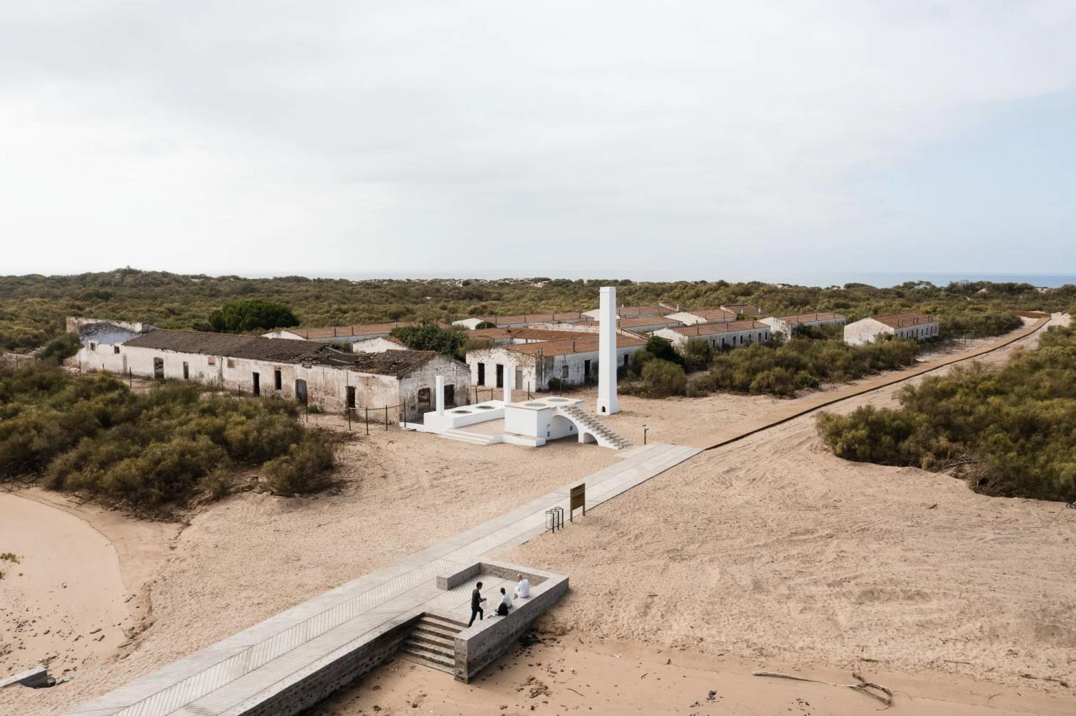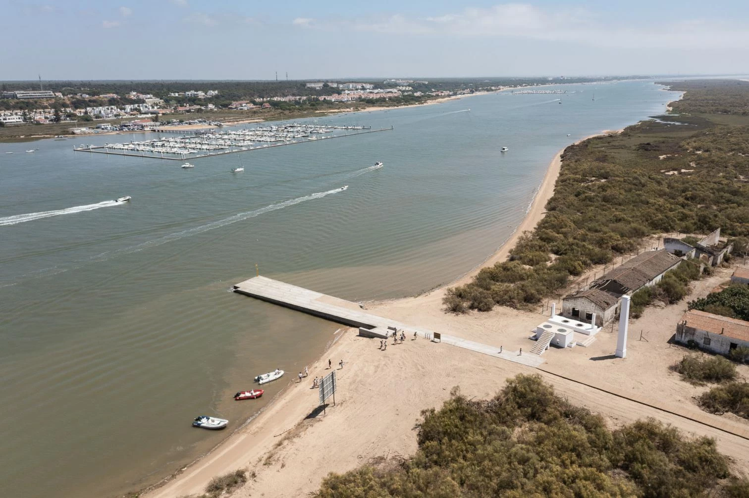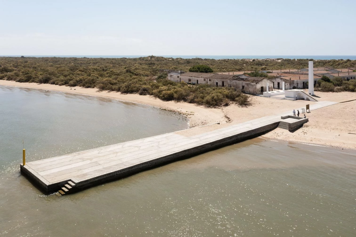 Desde tiempos prerromanos, el golfo de Cádiz ha sido escenario de la captura del atún de almadraba, según una técnica que apenas ha cambiado desde entonces. Con el fin de gestionar la explotación que calaba en aguas de la desembocadura del río Piedras, de 1929 a 1963 estuvo activo el Real de la Almadraba de Nueva Umbría, una colonia habitada estacionalmente por los pescadores. Tras décadas de abandono, como primer paso de una puesta en valor del conjunto se han recuperado algunas de las piezas industriales así como el antiguo embarcadero, cuyos restos se aprovechan como cimentación de un pretil de hormigón ciclópeo y una solera acanalada sobre el muelle.