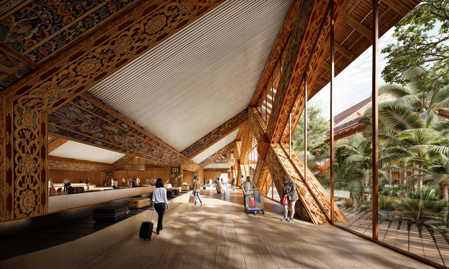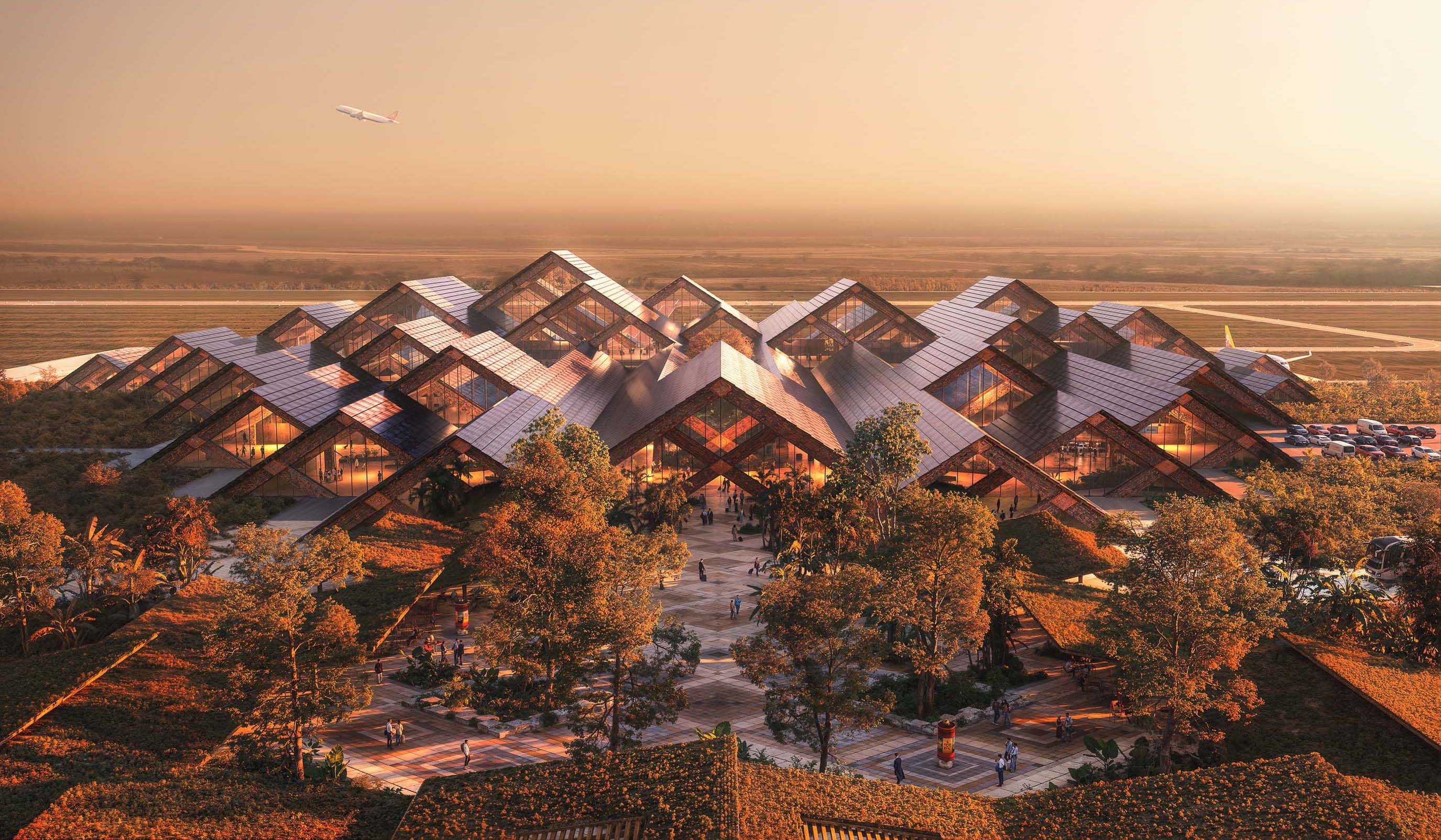 Con el Himalaya como telón de fondo, la estructura del nuevo aeropuerto adopta un diseño modular de madera tipo diagrid, cuya silueta a distancia semeja la cadena montañosa. Su cubierta, además, incorpora paneles fotovoltaicos, aprovechando la energía solar de manera eficiente.