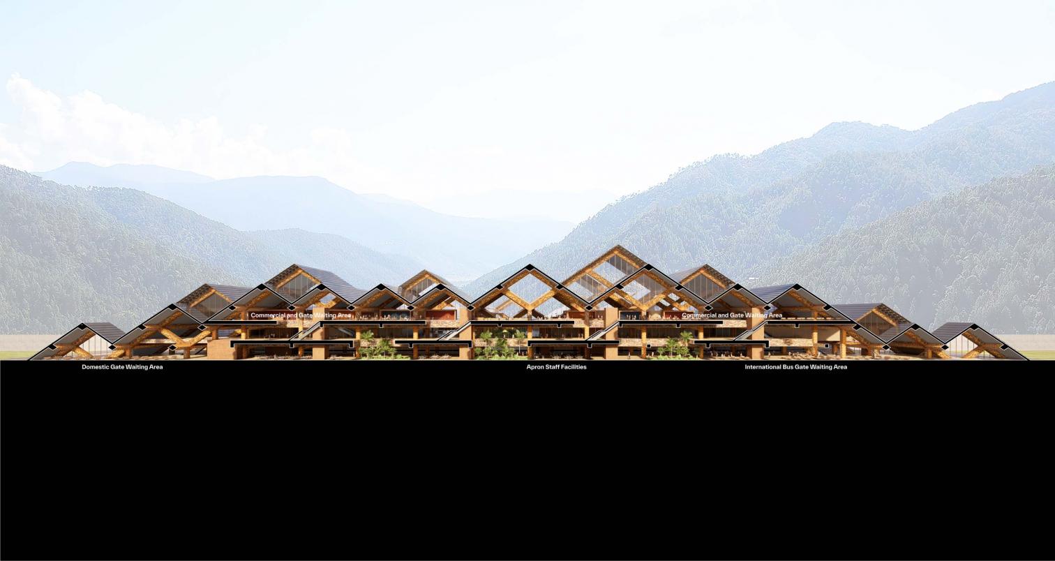 Adaptado al clima subtropical del sur de Bután, el aeropuerto incorpora sistemas pasivos propios de la arquitectura tradicional butanesa, que favorecen la circulación natural del aire. Su estructura de madera absorbe la humedad del aire, contribuyendo a regular la humedad interior. En el exterior, los aleros proporcionan sombra y protegen de las lluvias torrenciales. La inauguración del aeropuerto está prevista para 2029.