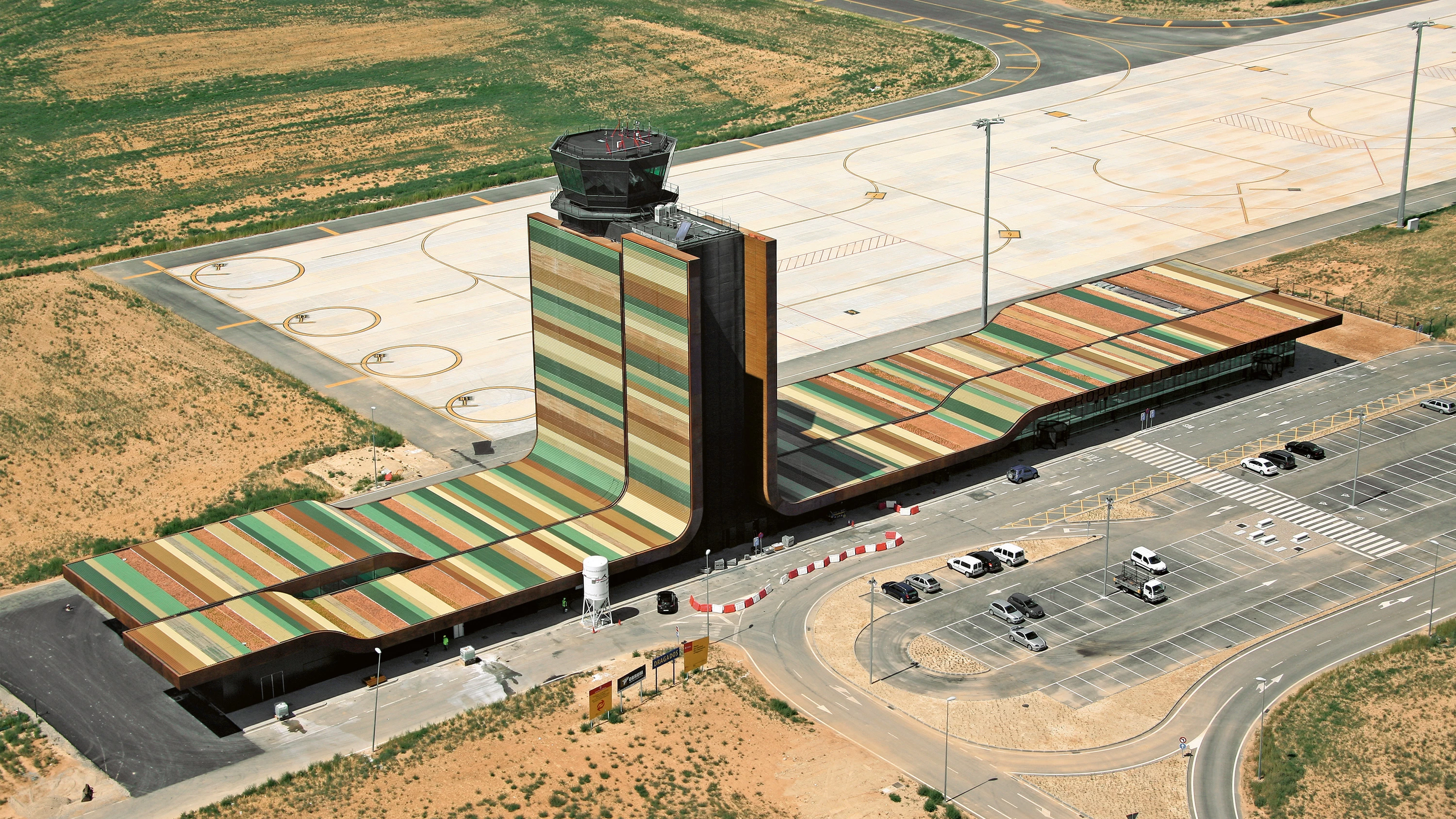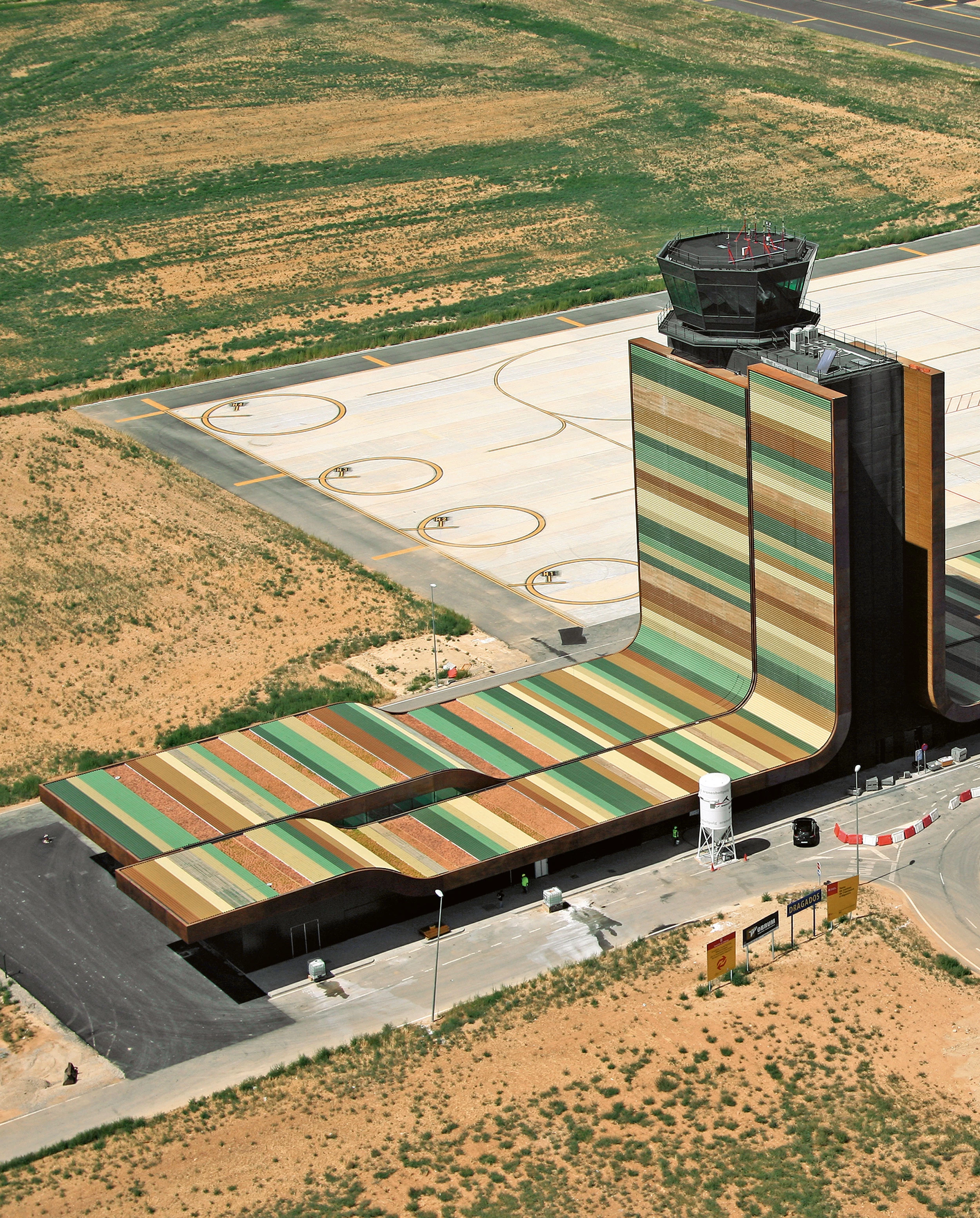 Recortado sobre la superficie limpia y amplia de los campos de cultivo, el edificio no busca las habituales metáforas formales de alas, aves o del mundo de la aerodinámica y la tecnología; en este caso, la combinación de acabados —vegetación, madera y chapa microperforada lacada— aporta una serie de texturas y tonos que remiten al entorno agrícola, vinculando así el aeropuerto al territorio en el que se inserta. La traslación de los colores de los cultivos a la cubierta y la fachada, cambiada de escala y regularizada, no pretende un mimetismo, sino una alusión directa al carácter del terreno, a su identidad. El resultado es una arquitectura que responde a los complejos requerimientos aeronáuticos, pero también a los territoriales y paisajísticos, revalorizando así su entorno, algo poco habitual en este tipo de instalaciones...[+]