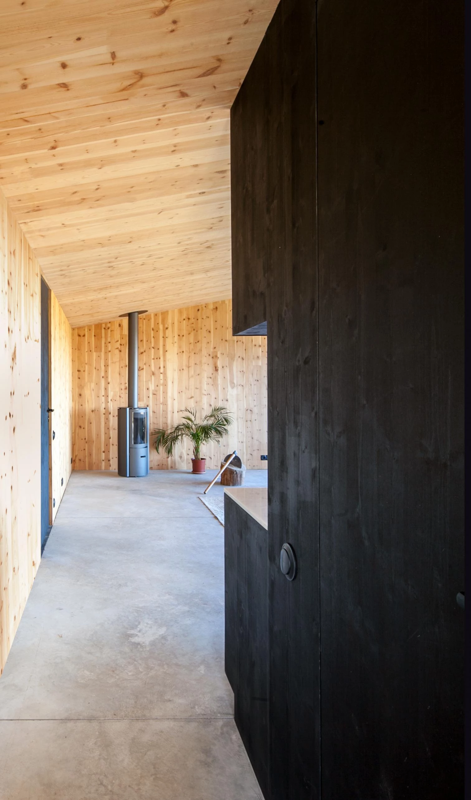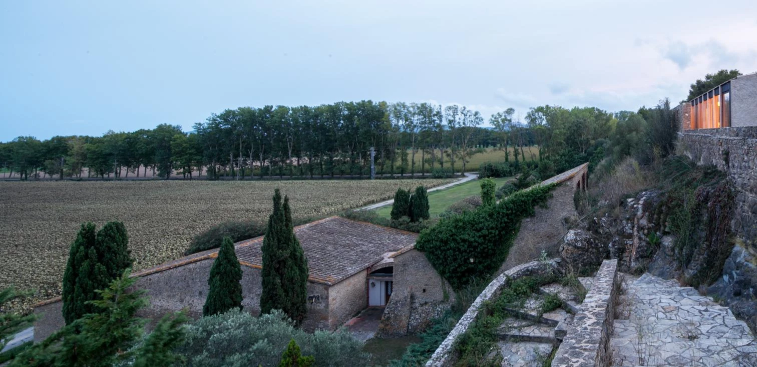 En la provincia catalana de Gerona, en la comarca del Bajo Ampurdán, se sitúa esta casa entre campos de girasoles, acechada por los fuertes vientos de la Tramontana. El encargo a la firma Ágora Arquitectura —liderada por los barceloneses Joan Casals Pañella y Jose Luís Cisneros Bardolet— requiere ubicar el proyecto al abrigo del único muro pétreo de una antigua masía que aún resiste en pie. La nueva construcción está separada 80 centímetros de las trazas de la vieja edificación. Coronada por tejas reutilizadas, la cáscara continua de madera contralaminada de pino recompone la ruina, envuelta con mortero de arena gruesa. Construida en noventa días, la vivienda de 80 metros cuadrados presenta dos habitaciones dispuestas paralelas al muro. En la parte central de la casa, una caja negra exenta contiene todos los servicios domésticos.