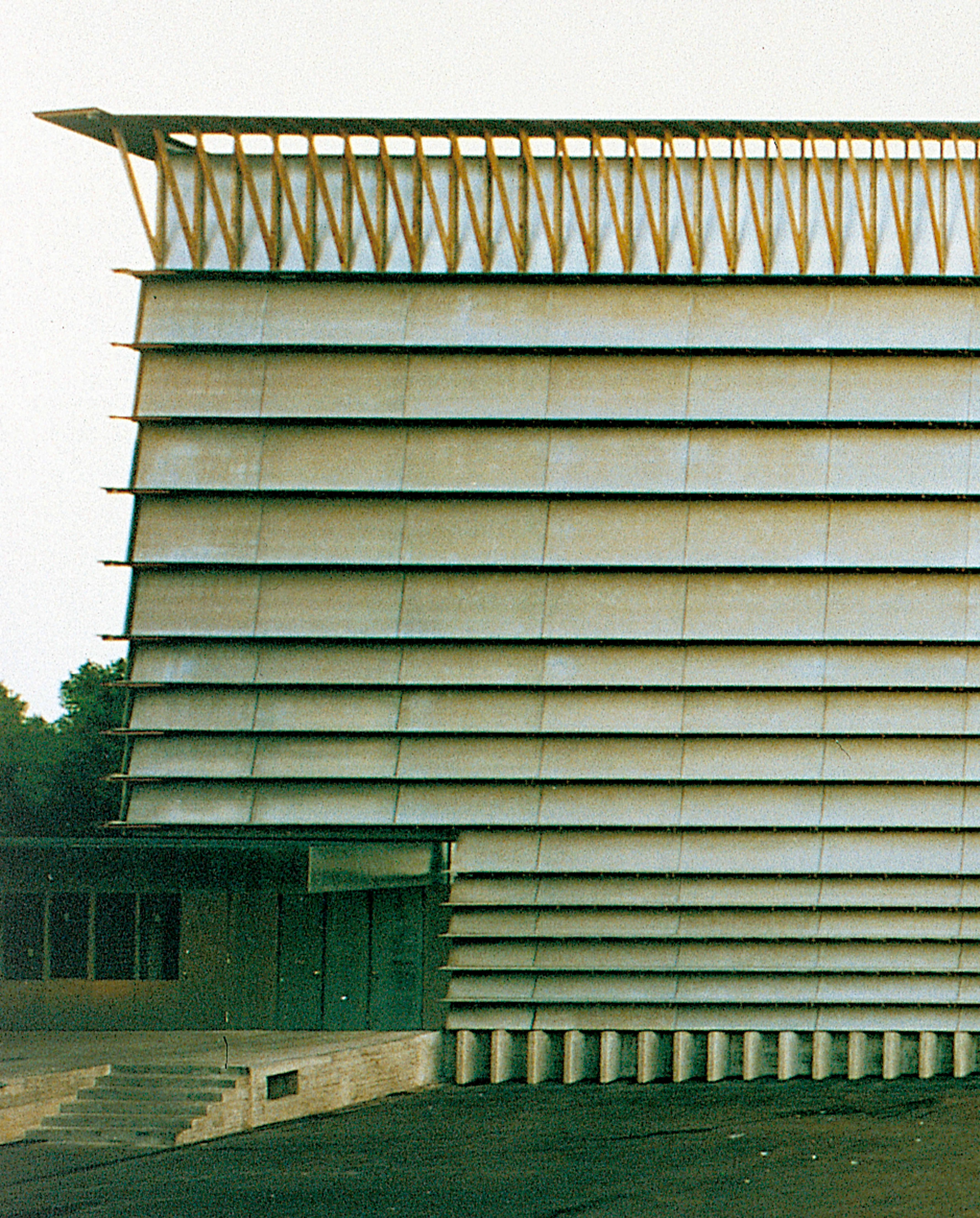 Situada en el cantón del Jura, la localidad de Laufen es conocida más allá de las fronteras suizas por ser la sede de la empresa Ricola, reputada fabricante de caramelos balsámicos. Para proporcionar un almacenaje automatizado a su stock de gominolas y hierbas medicinales era necesario añadir una nave a las instalaciones existentes. Un paralelepípedo de 60 x 26 x 17, cuyas medidas venían fijadas por el tamaño de las estanterías, fue el punto de partida de un encargo que consistió básicamente en diseñar una envolvente y decidir su emplazamiento. La pared de piedra de una cantera abandonada que forma la linde del solar sugería un telón de fondo apropiado para la nueva pieza, que se acercó a este límite para formar un patio de carga con el resto de la fábrica. Las pilas de tablas que se amontonan en las serrerías del valle de Laufen inspiraron la construcción del cerramiento. La estructura de la nave propiamente dicha consta de unas costillas metálicas —ancladas a la plataforma de hormigón sobre la que se asienta— que sustentan en paralelo unos soportes de madera con pequeñas consolas. A este entramado de madera se atornillan las placas de fibrocemento que caracterizan los alzados, con una disposición en horizontal y vertical que proporciona el lugar seco y fresco requerido para la conservación de los caramelos. Partiendo del tamaño estándar de las piezas, los paños de fachada se dividen en tres estratos de cinco bandas cada uno. La zona superior emplea las placas en su tamaño de fabricación, mientras la anchura de las inferiores es el resultado de dividir estas de acuerdo con las proporciones de la sección áurea; la pieza más grande se coloca en la parte intermedia del alzado y la pequeña en la inferior, imprimiendo una cadencia a la fachada que alude a la gravedad y al peso de la mercancía apilada.