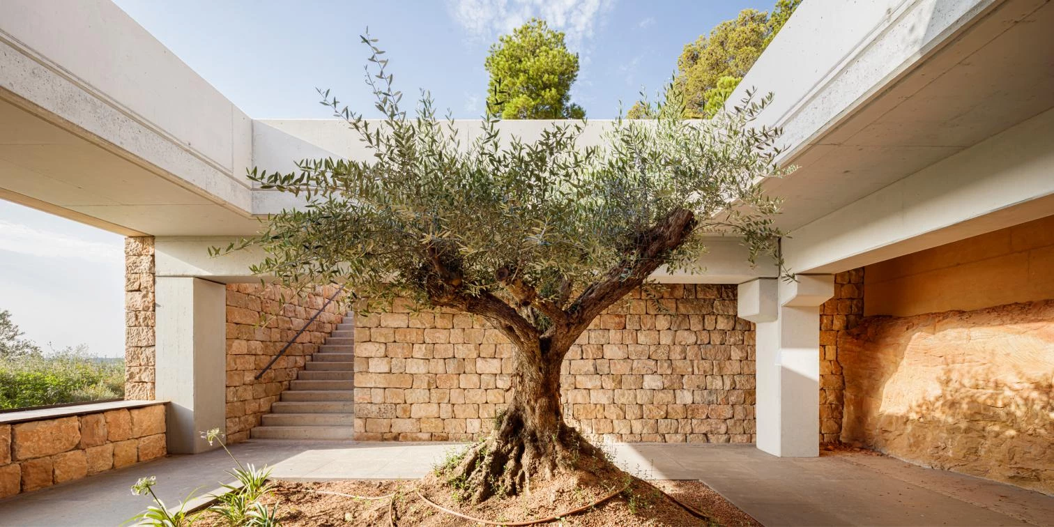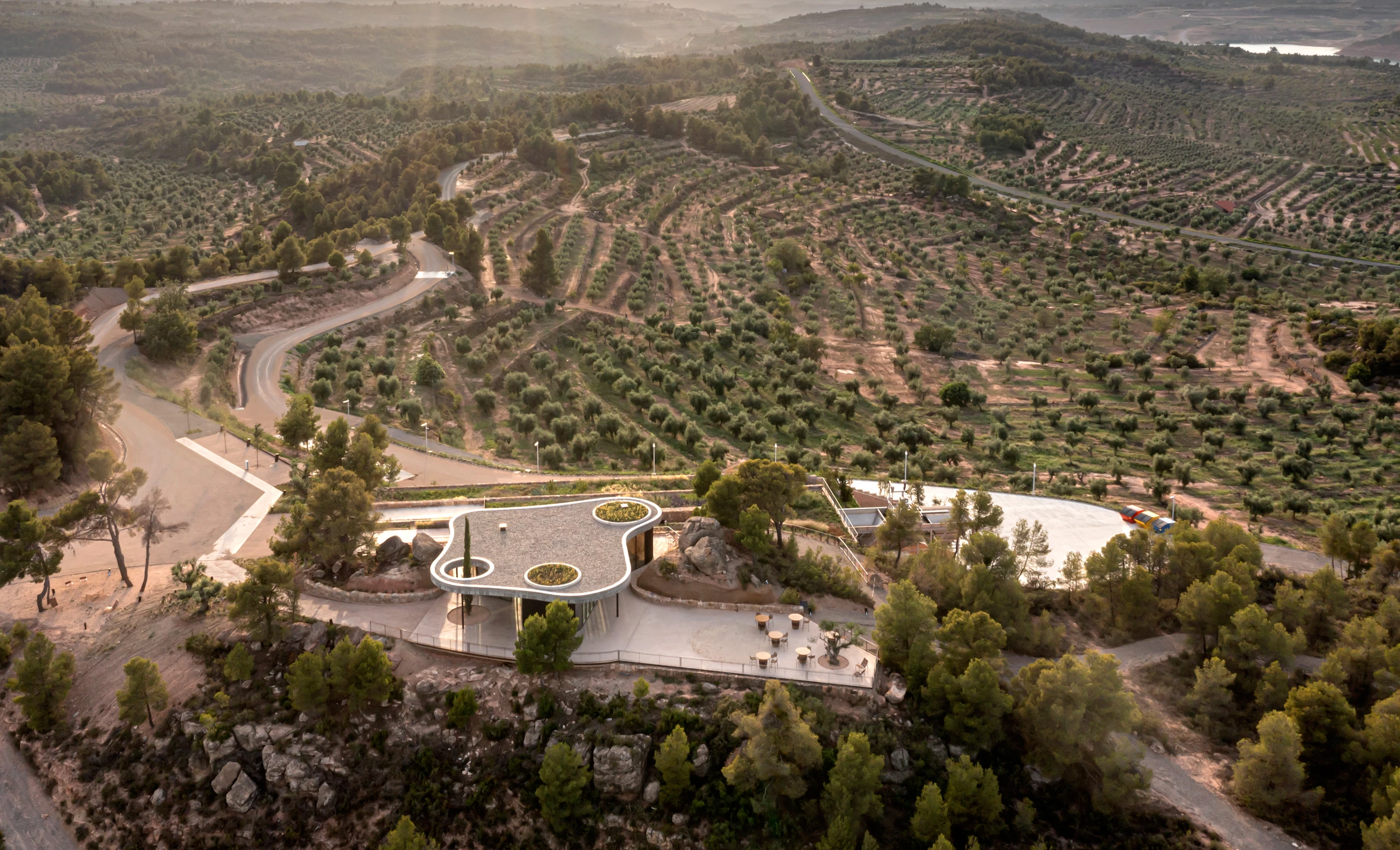 Fusionándose con el paisaje, el 90% de la almazara está oculta dentro de la colina, mediante una disposición escalonada del programa, adaptado a las terrazas de cultivo originales, cuyos muros pétreos se restituyen. En consecuencia, la mayor parte del edificio está enterrado, desaparece. Las cubiertas se convierten en espacios verdes visitables con olivos y flora autóctona, mientras que las fachadas de piedra seca se distribuyen paralelamente y a diferente nivel siguiendo la topografía.