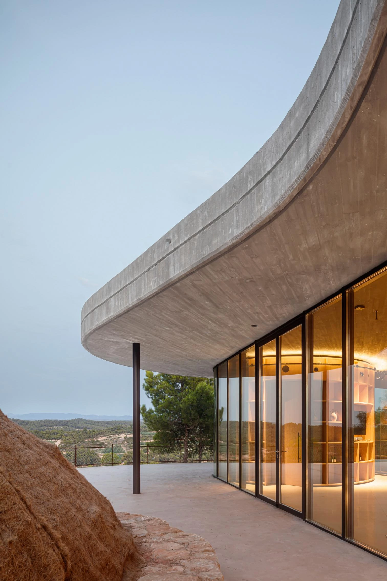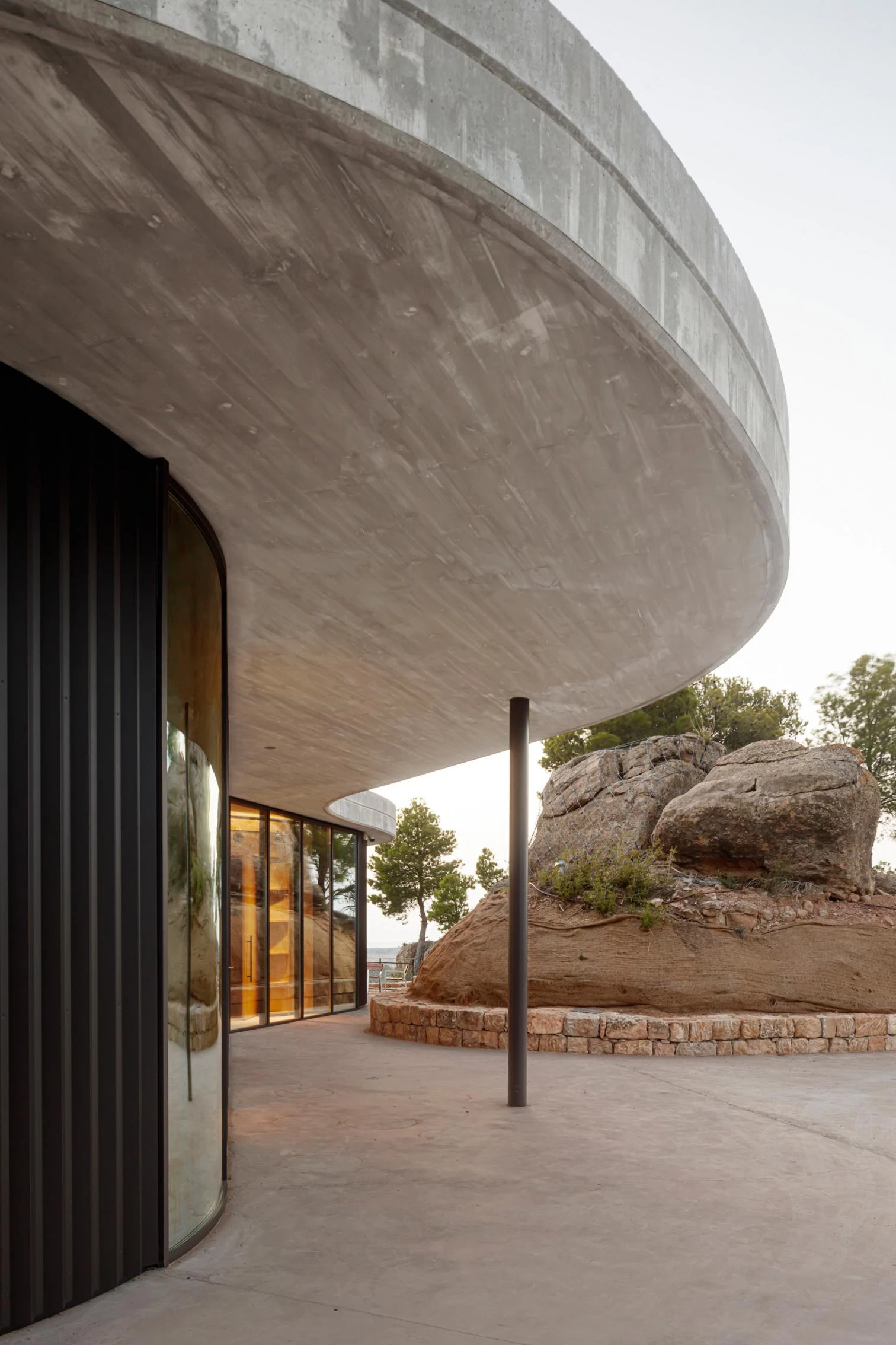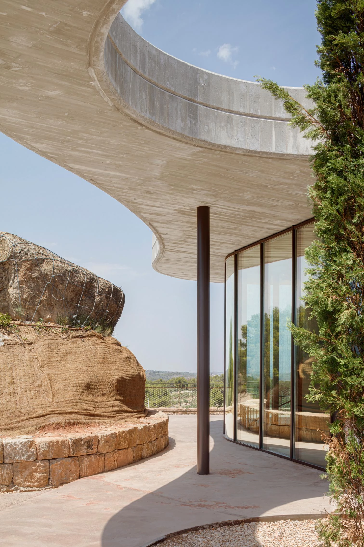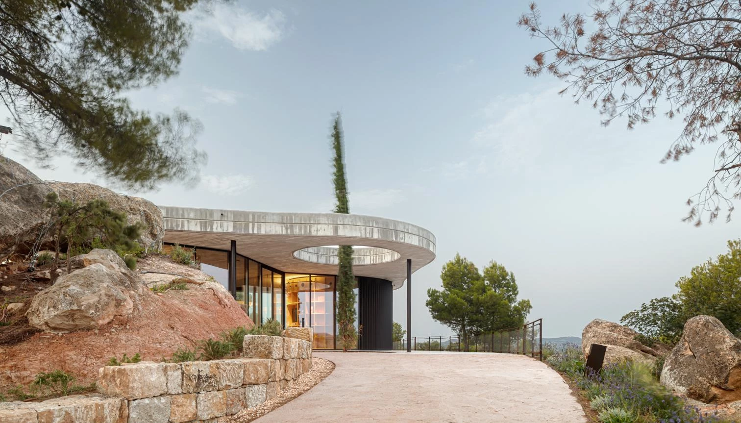Estas instalaciones para la producción de aceite ecológico de la finca de Cuadrat Valley se sitúan en una colina formada por antiguas terrazas de cultivo, en la comarca catalana de Las Garrigas. En la cima se ubica el pabellón de recepción de visitantes y la tienda para degustar los productos elaborados. Este es el único volumen visible del conjunto. Su forma orgánica se adapta a la morfología de dos agrupaciones rocosas. Su cubierta de hormigón se curva para sortear el entorno natural, y su fachada vidriada permite disfrutar de las vistas de la sierra del Montsant y la cordillera pirenaica.