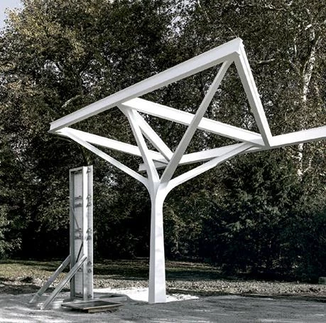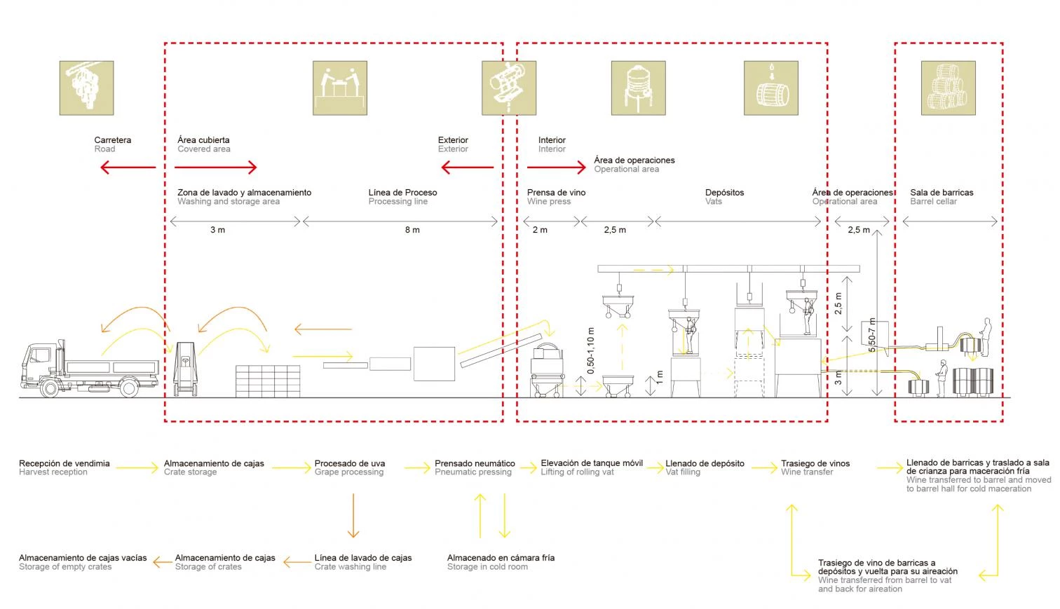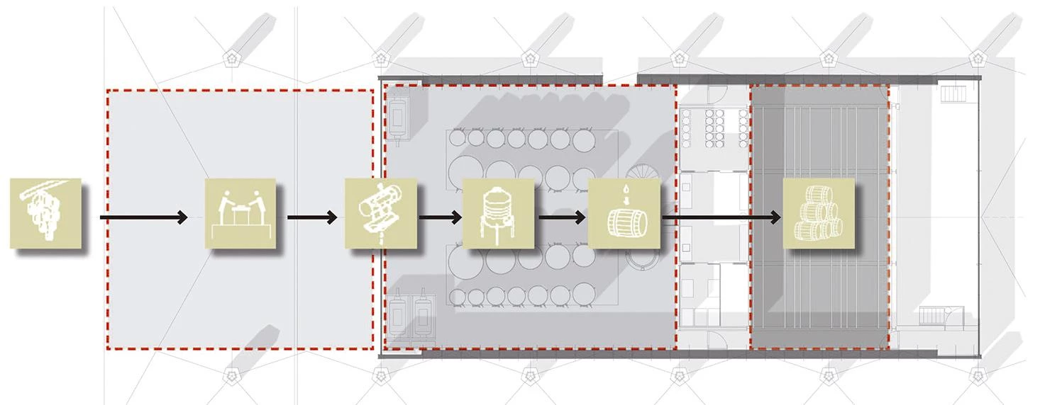 El proyecto para la ampliación de la bodega Château Margaux, uno de los productores de vino más importantes del mundo, incluye el diseño de un nuevo edificio destinado principalmente a variedades de uva blanca. La nueva construcción se extiende a partir del ala este siguiendo la línea de cornisa de los volúmenes existentes. El objetivo primordial de la intervención es crear un amplio espacio abierto, protegido por una gran cubierta, para albergar las cintas transportadoras usadas en el breve periodo de la vendimia. Durante el resto del año, este espacio sirve para celebrar eventos, y se convierte en un nuevo vestíbulo de entrada. Además, la cubierta alberga las instalaciones, espacios de oficina y un centro de investigación y desarrollo. En su simplicidad, el nuevo edificio reinterpreta la lógica de las instalaciones industriales y fortalece la relación entre el proceso de producción y la arquitectura. Un tejado a dos aguas cubierto con tejas recicladas camufla entre las construcciones tradicionales una estructura contemporánea, formada por una serie de pilares de acero que se abren para generar cinco ramas y que sostienen una trama diagonal perforada en la vertiente este por lucernarios. Los muros de las distintas áreas bajo la gran cubierta no son estructurales, por lo que se podrían modificar completamente en el futuro. De esta manera, el edificio hace frente al doble reto de cumplir los requisitos técnicos y respetar el conjunto tradicional existente. Las demás edificaciones de la bodega se han restaurado manteniendo su carácter original.