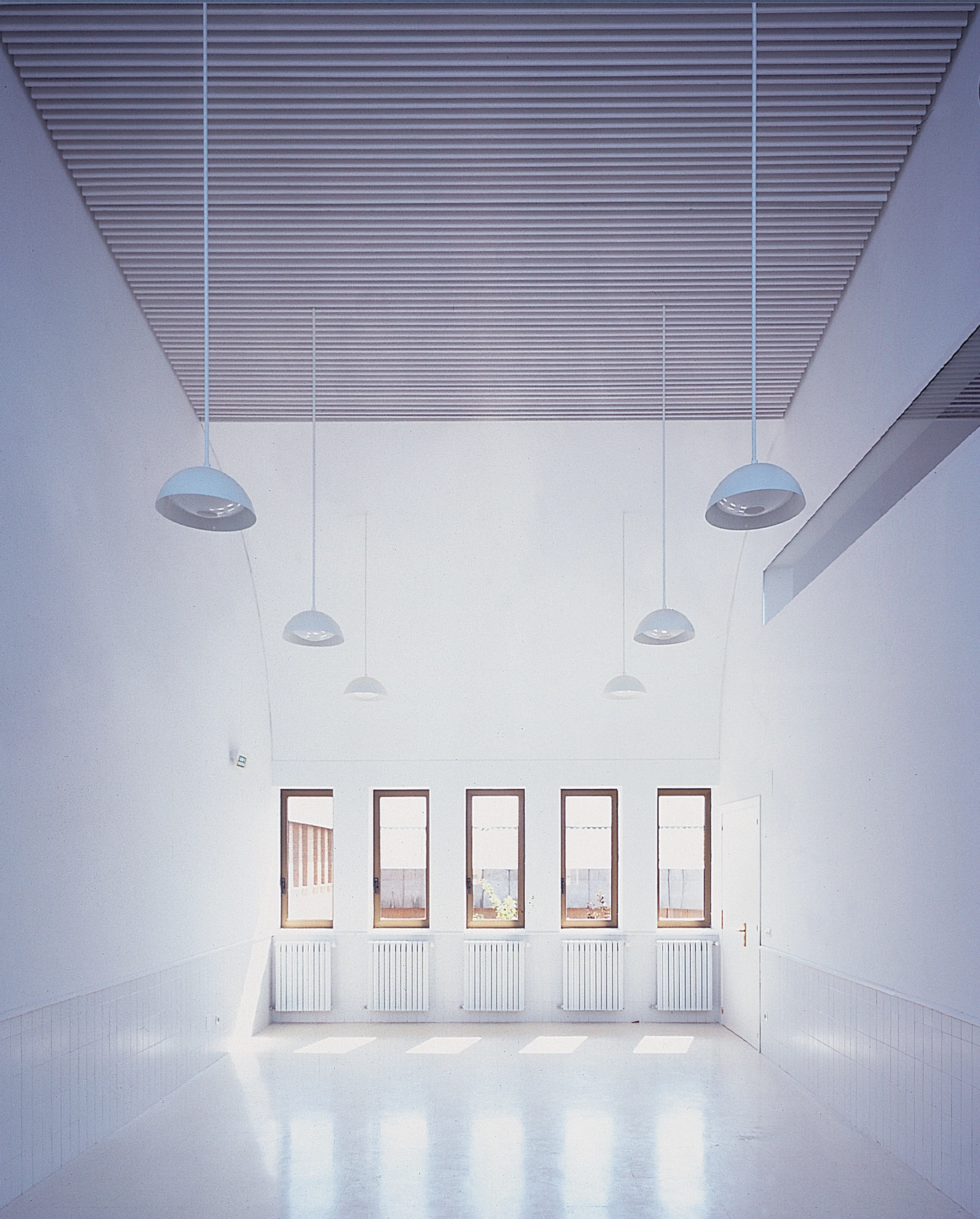 Sobre la antigua galería central se apoya una nueva crujía de 10,5 metros, a la que se adosa un cubo pétreo que avanza sobre la superficie del patio. Este volumen se incrusta en planta baja para alcanzar la altura apropiada como salón de actos; un ligero retranqueo en su perímetro resalta la sensación de ingravidez sobre la pradera. Coronando el último nivel, una pieza acristalada contiene el nuevo invernadero. La estructura general, de pórticos de hormigón con dos apoyos, mantiene en voladizo sus extremos para evitar posibles interacciones con las piezas adyacentes y facilitar la distribución de las aulas.